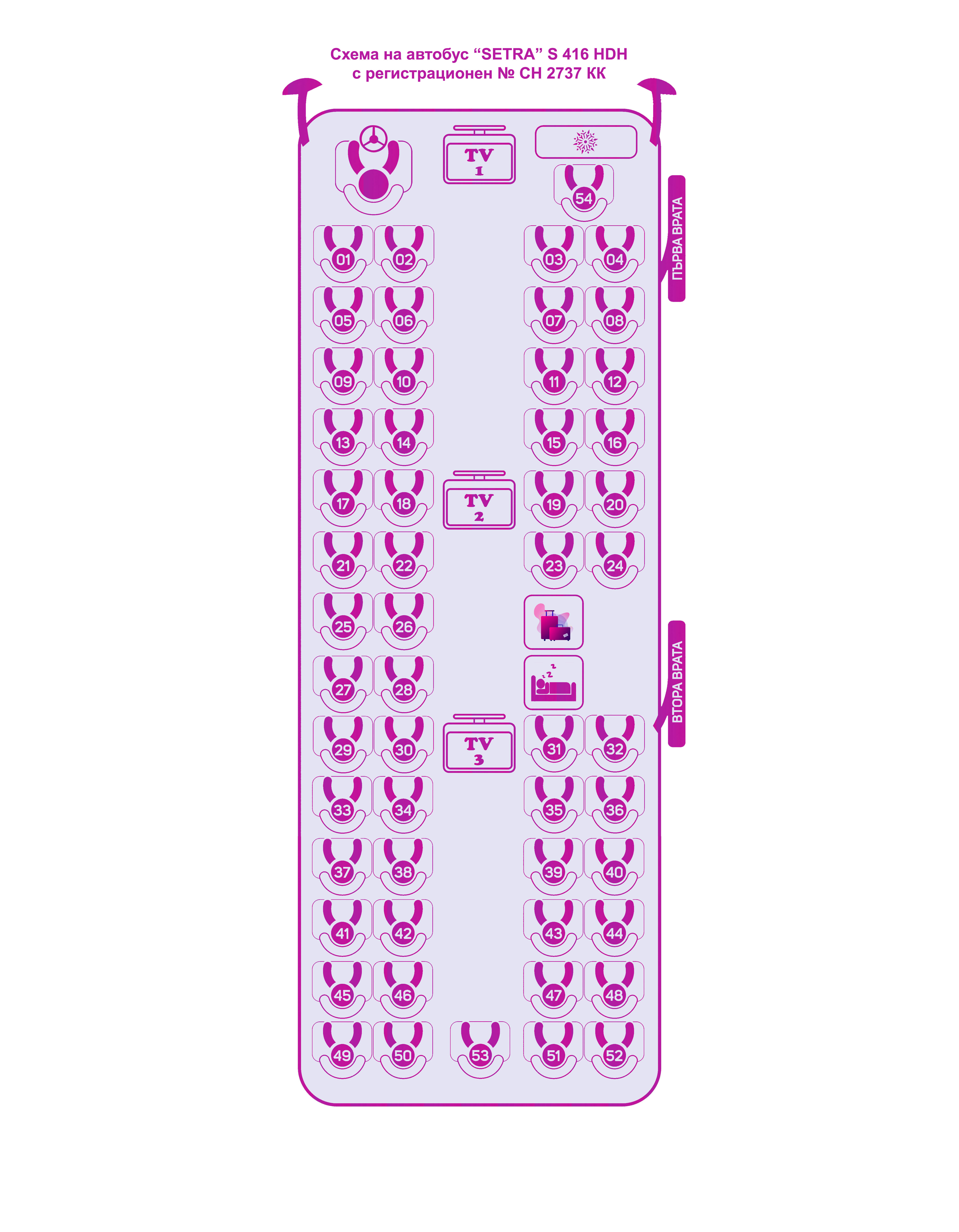 Схемата за разпределение на местата в автобуса може да свалите от линка тук: Изтегли схема на автобуса от тук