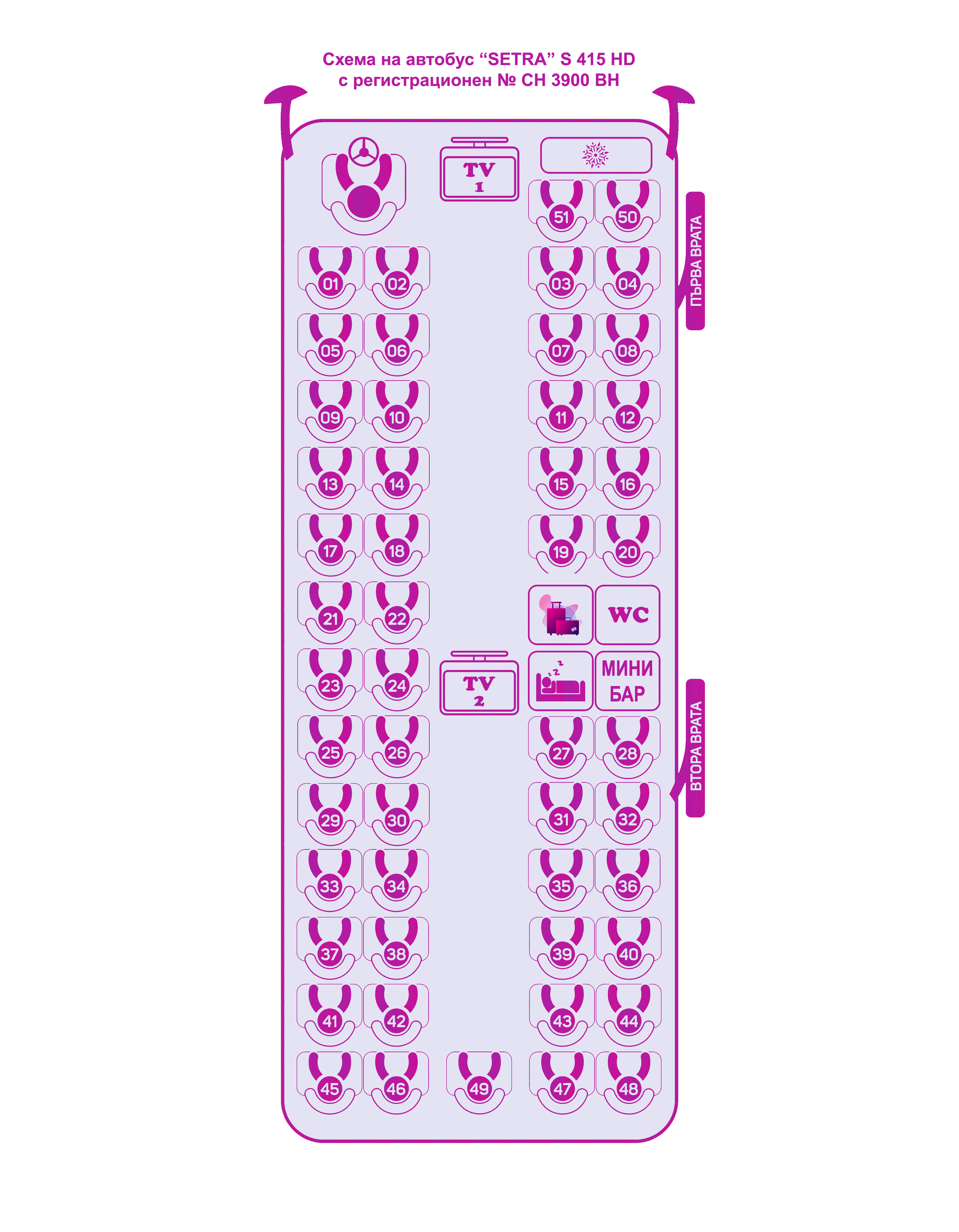 Схемата за разпределение на местата в автобуса може да свалите от линка тук: Изтегли схема на автобуса от тук