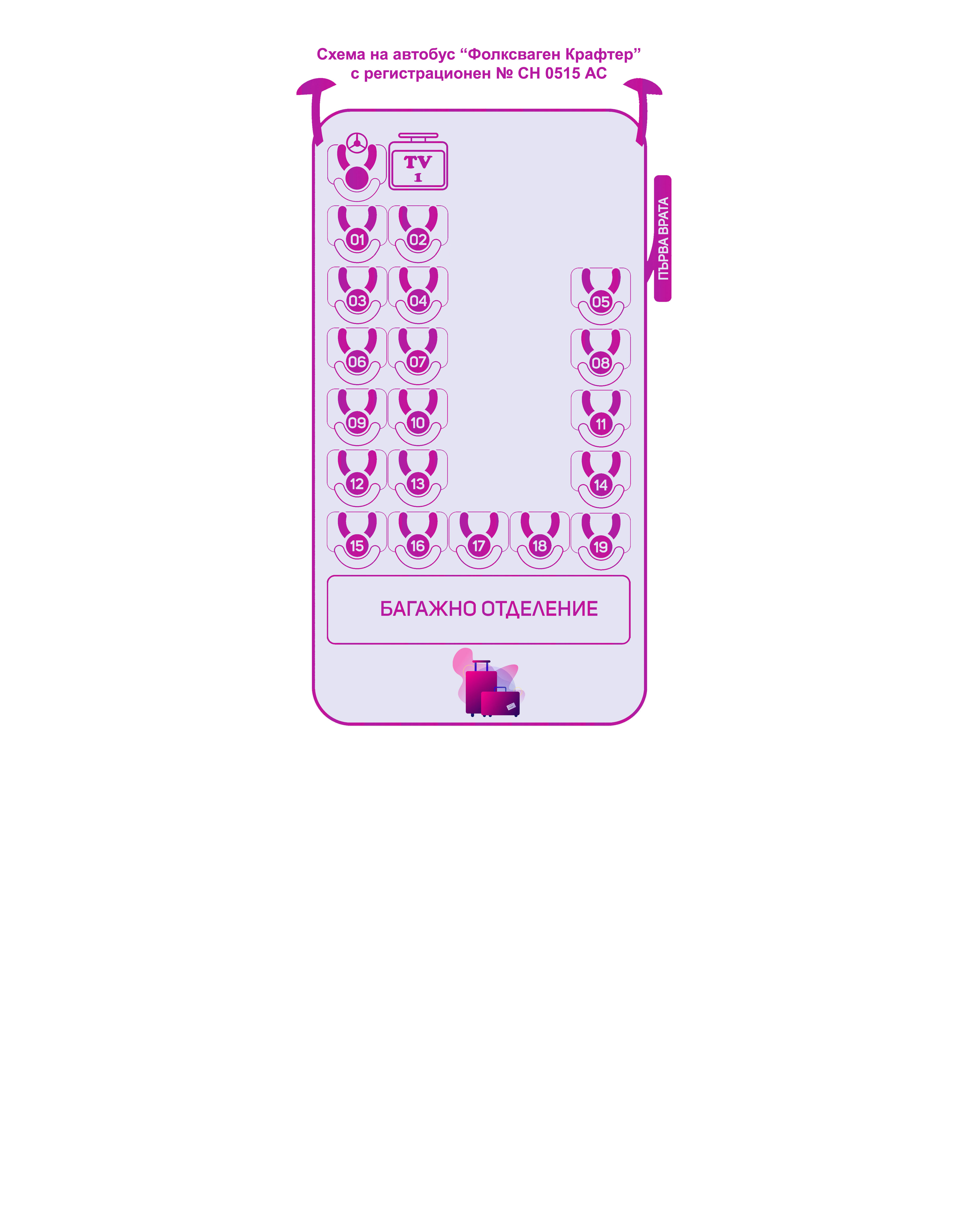 Схемата за разпределение на местата в автобуса може да свалите от линка тук: Изтегли схема на автобуса от тук