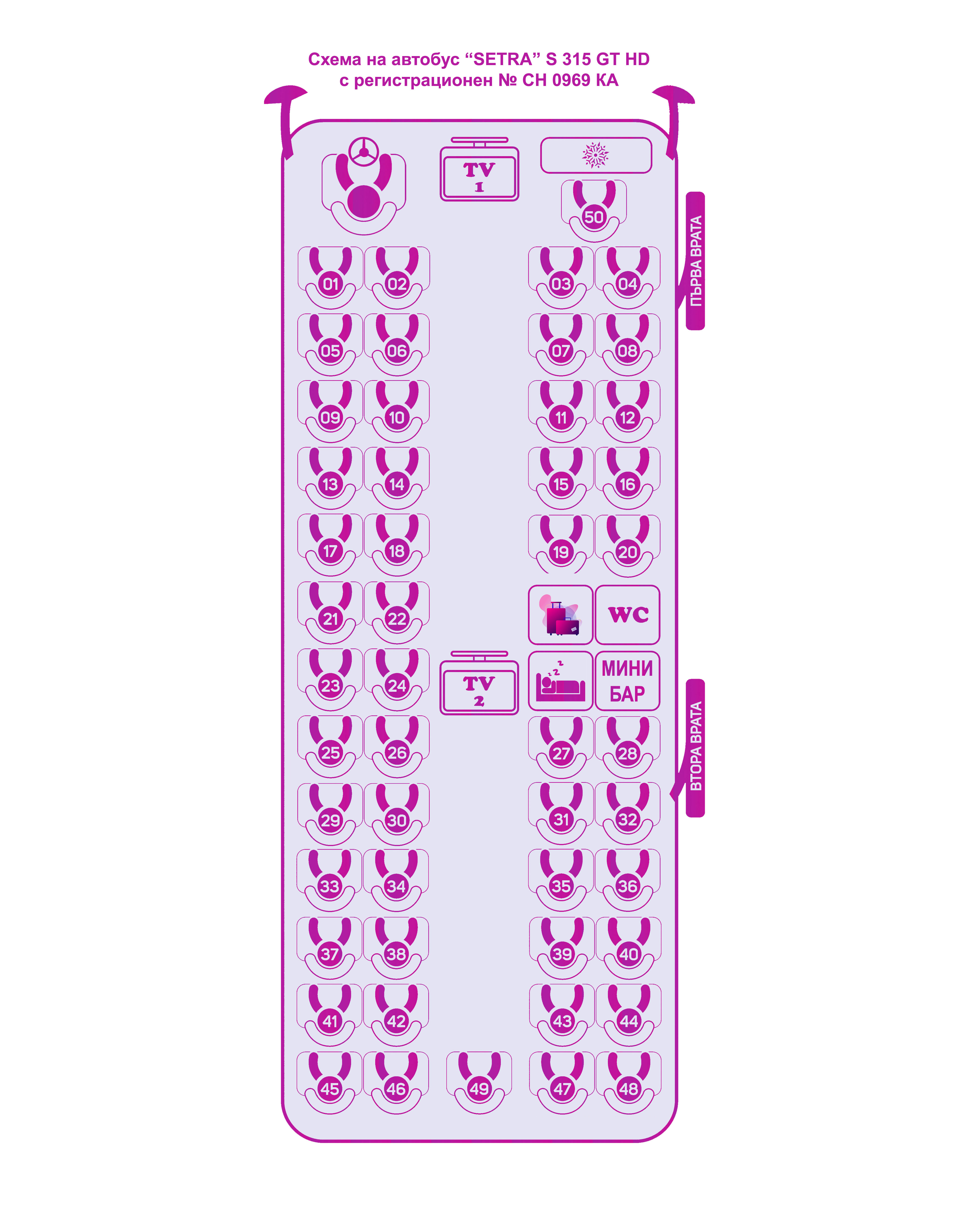 Схемата за разпределение на местата в автобуса може да свалите от линка тук: Изтегли схема на автобуса от тук