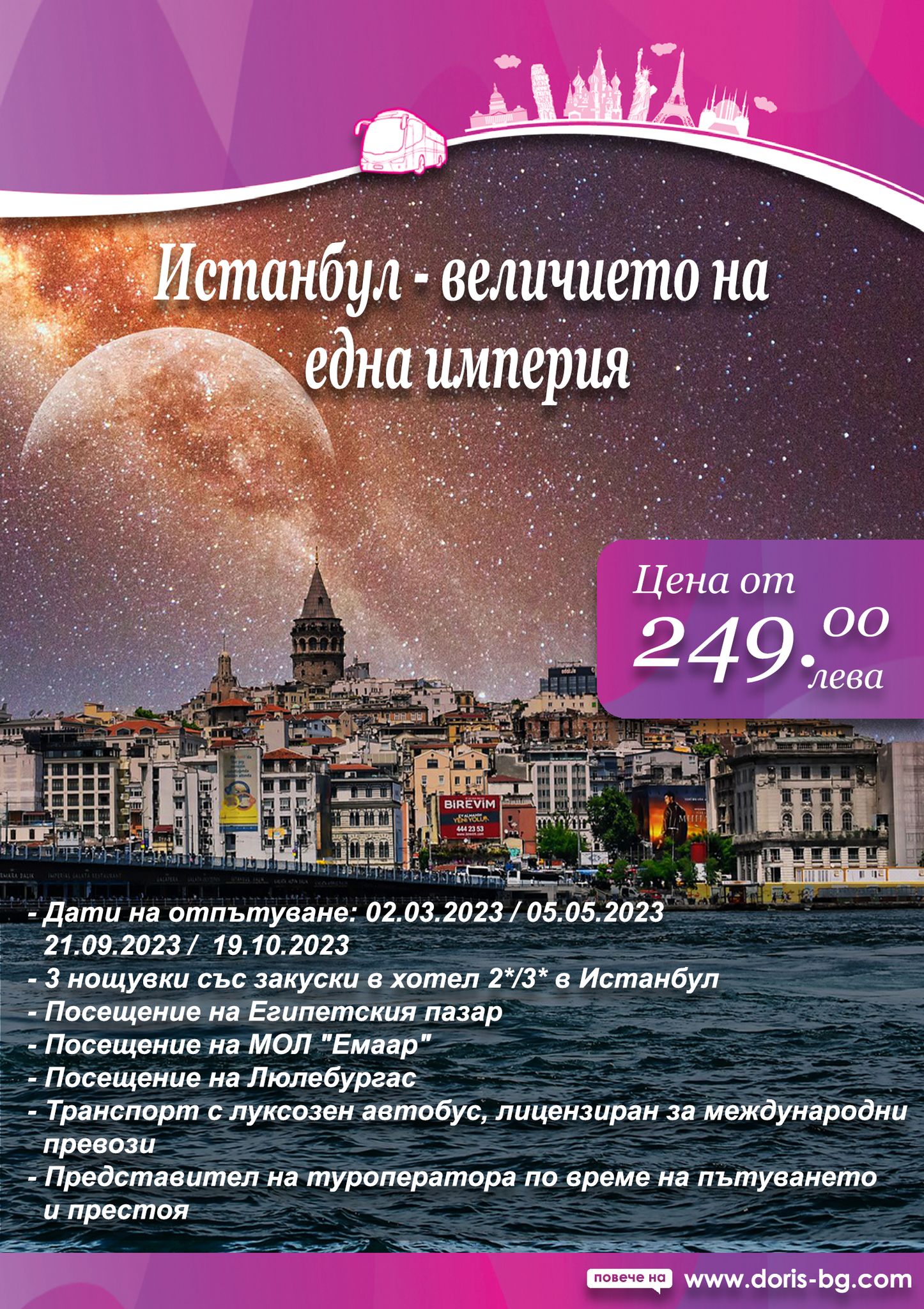 Истинско пътешествие във времето на най-бляскавото величие на Османската империя ще Ви предложи тази програма. Екскурзията „Шарен Истанбул” е весела разходка в пъстрия „Балат”, където се намират сградата на Вселенската патриаршия и желязната българска църква „Свети Стефан”. Не пропускайте разходката в района на прочутия „Истиклял” с неговата уникална атмосфера, изкачете кулата Галата, вижте красивия като куклен дом дворец „Бейлербей”, удивете се на танца на Пеещите фонтани и украсете тази незабравима среща с Истанбул с Круиз по Босфора. А на връщане Ви очаква приятна шопинг пауза в Люлебургас!