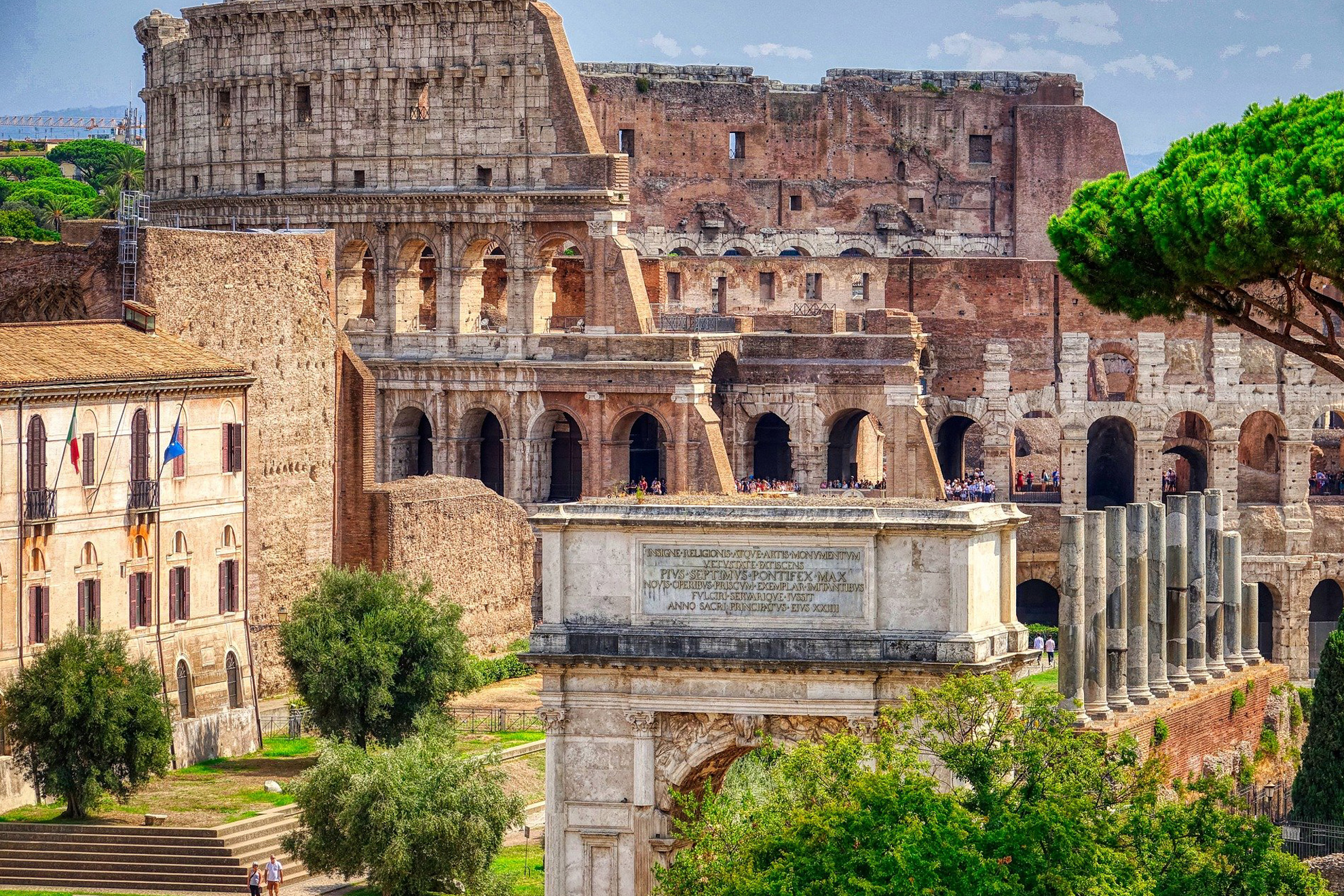 Отправяме се към Римския форум, който се намира между Палатинския и Капитолийския хълм. За да освободят място за този внушителен комплекс, римляните пресушили блато и построили основните сгради на древния град, превръщайки пространството в средище на търговията, религията, съдебната система и обществения живот. Днес внушителни колони дават простор на въображението, за да си представим мащабите на постройките. Императори издигнали арки на територията на Форума, за да увековечат своите победи. Първата е на император Тит и под нея минава Виа Сакра (Сакралният път). Днес частично е запазена арката на Август, а последната – на Септимий Север, може да бъде видяна в североизточната част на Форума. Ще минем покрай останки от храмове, базилики, мястото на Сената.