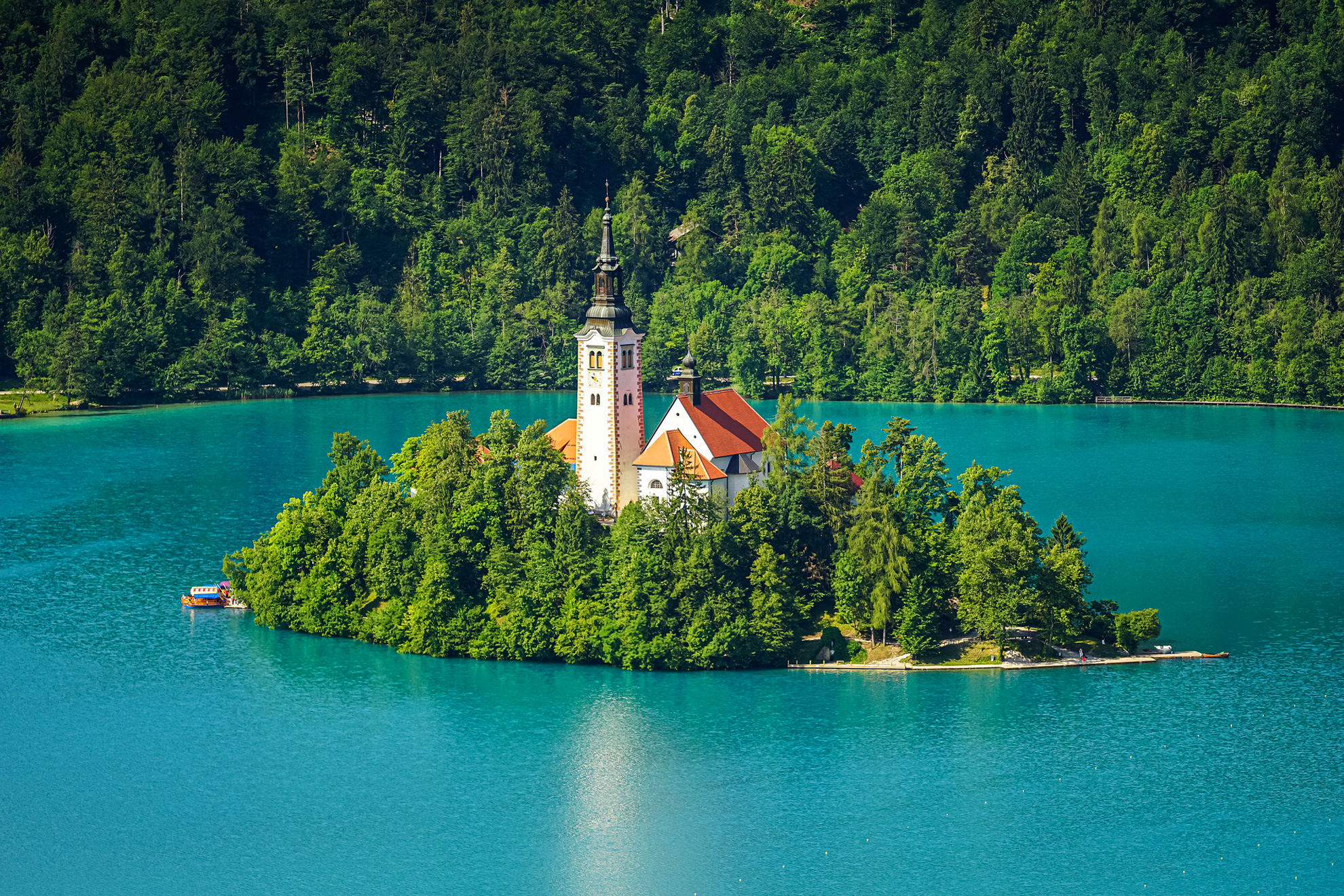 Качваме се на корабче, което ще ни отведе до острова на цар Блед в средата на ледниковото езеро. Църквата „Успение Богородично” на острова е трикорабна римска базилика. През XV в. е преустроена в готически стил. През 1509 г. е разрушена от земетресение. Сегашния си вид, в бароков стил, придобива през XVII в. Главният олтар се отличава със статуята на Дева Мария и е там от 1747 г. Камбанарията е от XV в., висока 54 м и има три камбани. Една от тях е известна като „Камбаната на желанията”. Легендата гласи, че желанието ти ще се сбъдне, ако удариш камбаната в чест на Богородица. През вековете кулата е реновирана няколко пъти. До църквата водят 99 стъпала, по които младоженците пренасят бъдещите си съпруги. Булката трябва да запази мълчание, за да се радват съпрузите на дълъг и щастлив семеен живот. По желание (с доплащане), разглеждане вътре на храма и изкачване на камбанарията.