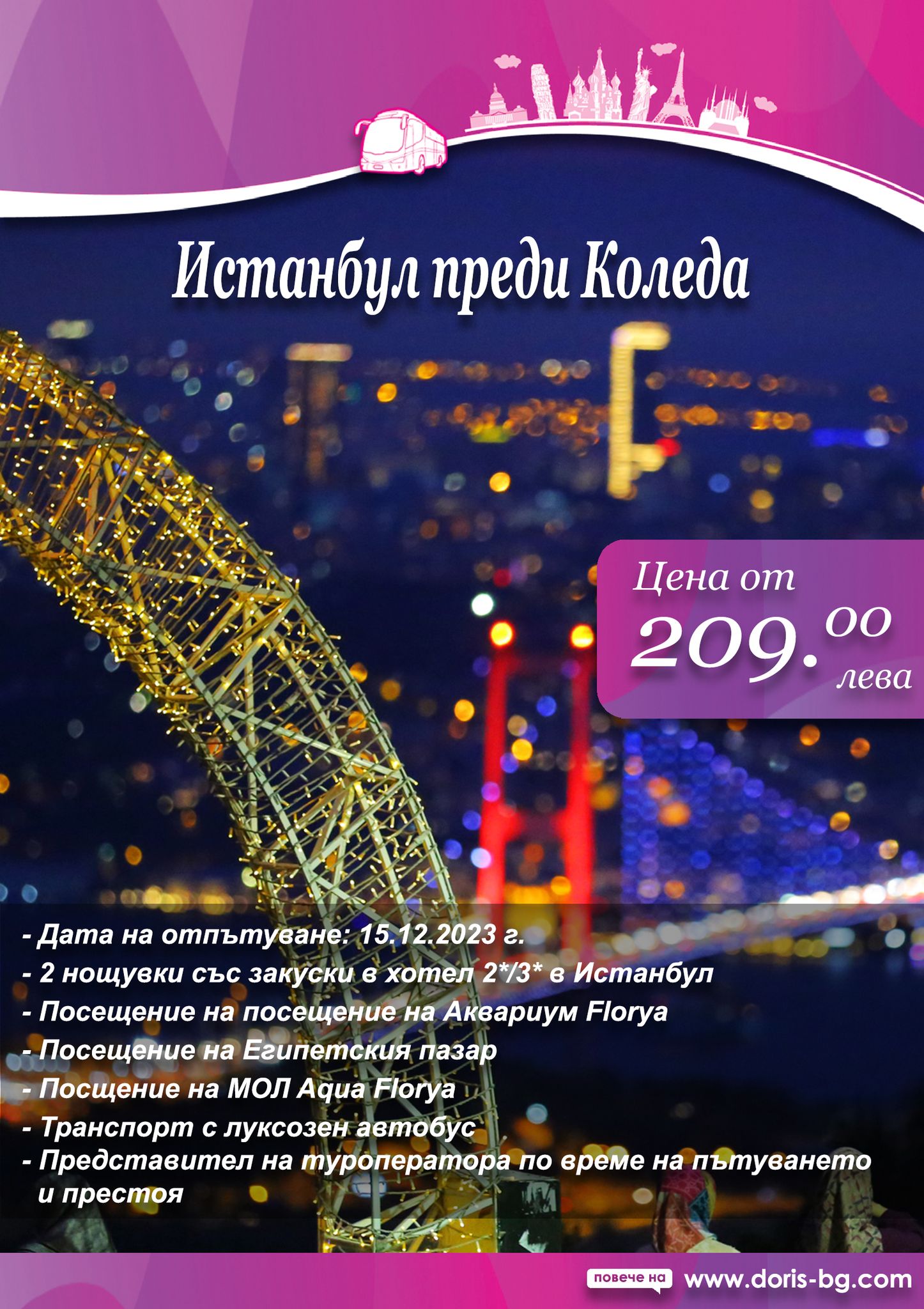 Отпътуваме от съответния град към границата с Турция и към Перлата на Ориента - Истанбул. Пристигаме около 8:30 ч. Преди зимните празници Истанбул е подготвил за нас цветни емоции, много базари, добре заредени магазини, предлагащи големи отстъпки, за да можем да напазарувате красиви подаръци за най-близките, които да поставим под елхата. Срещата ни с космополитния град започва, по желание (с доплащане) с *обзорна обиколка на Истанбул с професионален екскурзовод и лицензиран туристически автобус. Посетените по време на екскурзията забележителности нямат входни такси – Египетския обелиск, Змиевидната колона, Фонтана на Вилхелм II. За Синята джамия, Топкапъ сарай, храм “Света София” и Долмабахче сарай се дава информация без да се посещават. При възможност – посещение на храм „Света София". Църквата на Божията Премъдрост е истински шедьовър на величието и славата на Ислямския Изток и Християнския Запад, както и едно от най-важните доказателства за хуманност – със сигурност единствено тя, в продължение на 1400 г., е служила както на Християнския, така и на Ислямския свят. Ще минем по въжения мост над Босфора към азиатската част на града, където ще посетим местността Чамлъджа. На това невероятно място ще имаме на разположение около 30 мин. за ароматно турско кафе и страхотни селфита на фона на прекрасната гледка. Похвалете се на всички - вие сте на екскурзия в Истанбул! Следва връщане в европейската част и съвременния център на града Ще минем над Златния рог - залив на границата между Босфора и Мраморно море, едно от най-красивите природни пристанища в света. Преди Рождество ще посетим и възстановената българска желязна църква “Св. Стефан”, превърнала се в символ на българите християни в Истанбул.