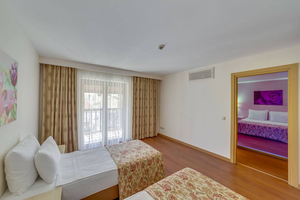 Хотелът се състои от един 8 етажен корпус със 192 стандартни стаи (88 с изглед към морето) и 18 двустайни фамилни стаи (2 спални с врата, максимум 5 души., 30–35 кв.м). Всички стаи имат централен климатик, сателитна телевизия, телефон, минибар (пълен при пристигане), сешоар, дигитален сейф, вана, тоалетна и паркет. Почистване на стаите - всеки ден, смяна на спалното бельо - 3 пъти седмично, смяна на кърпите – всеки ден.