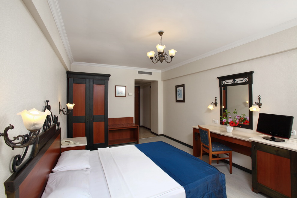 Хотелът се състои от от две основни 5-етажни сгради (3 асансьора), в които са разпределени 210 климатизирани стаи: 59 Standard Room Land View (17 кв.м), 89 Standard Room Sea View (17 кв.м), 22 Family Room Land View (35 кв.м) и Family Room Sea View (35 кв.). Те са оборудвани с телевизор, телефон, минибар (платен), сейф, баня душ/вана, сешоар, балкон. Стаите се почистват всеки ден, кърпите се сменят всеки ден, спалното бельо се сменя 3 пъти седмично.