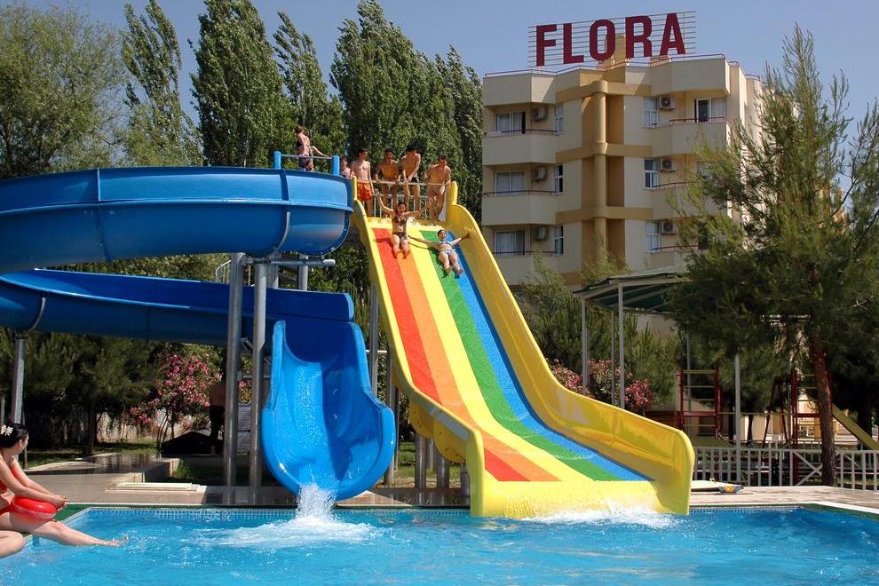 Flora Suites Hotel се намира на 700 м от собствен пясъчен плаж на Long beach, осигурен е безплатен шатъл. Има един открит плувен басейн за възрастни, един басейн за деца, две водни пързалки. Чадъри и шезлонги на басейните и на плажа се ползват безплатно.
