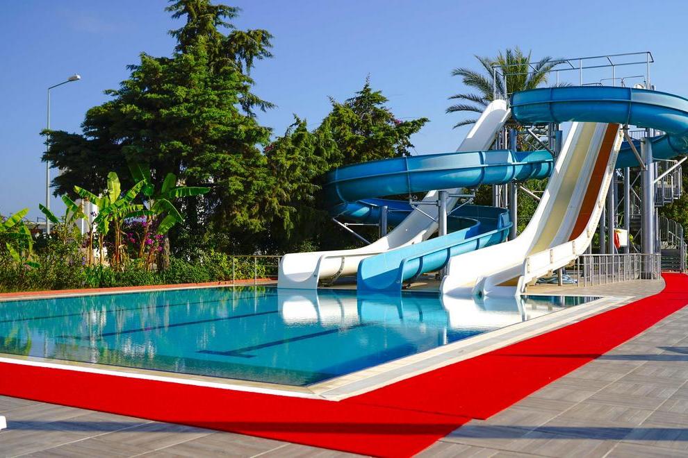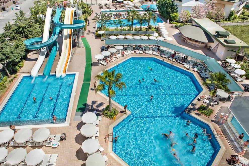 Собствен пясъчно-чакълест плаж, който е на 50 метра от хотела с подземен преход под главния път. Има също 2 открити басейна - 350 и 400 кв.м, басейн с пързалки - 120 кв.м, закрит басейн, детски басейн. Плажът е с тенти. Безплатни шезлонги, матраци, плажни кърпи.