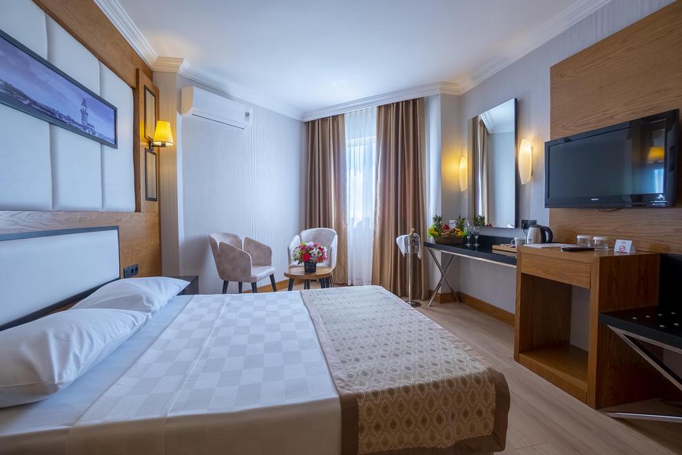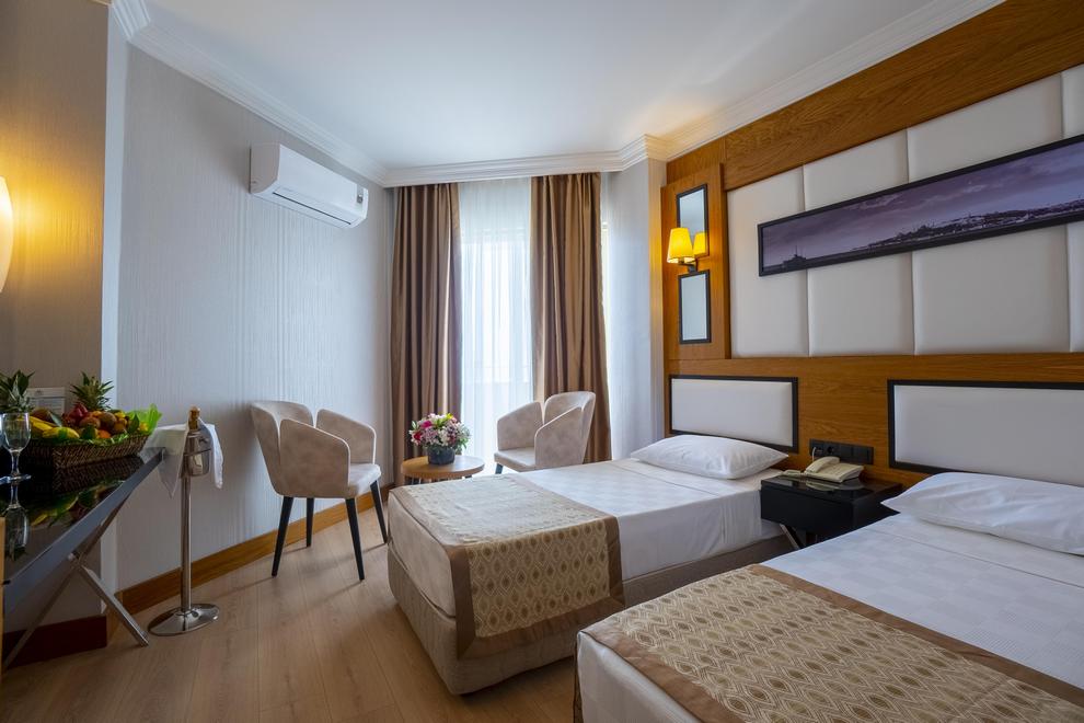 Хотелът се състои от два основни 5-етажни корпуса и пет 3-етажни вили (50% от стаите са с директен или частичен изглед към морето). 307 standard room, 3 стаи за инвалиди, 5 двустайни family room, 30 двустайни villa family room F. Стаите разполагат с баня с вана, баня с душ (в стаите за инвалиди), сешоар, индивидуален климатик, телевизор, телефон, мини бар (зарежда се ежедневно с вода, безплатно), сейф (в стаите, срещу заплащане), под – мокет (Hotel), теракот (Villa), балкон. Стаите се почистват ежедневно, спалното бельо се сменя два пъти в седмицата. Room service (срещу заплащане).