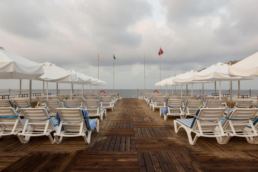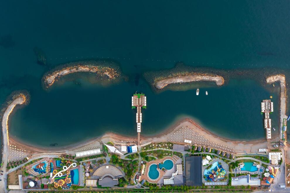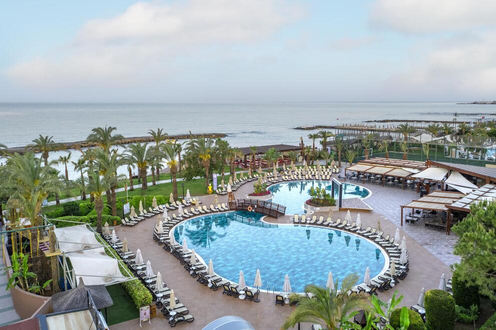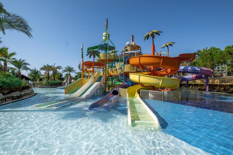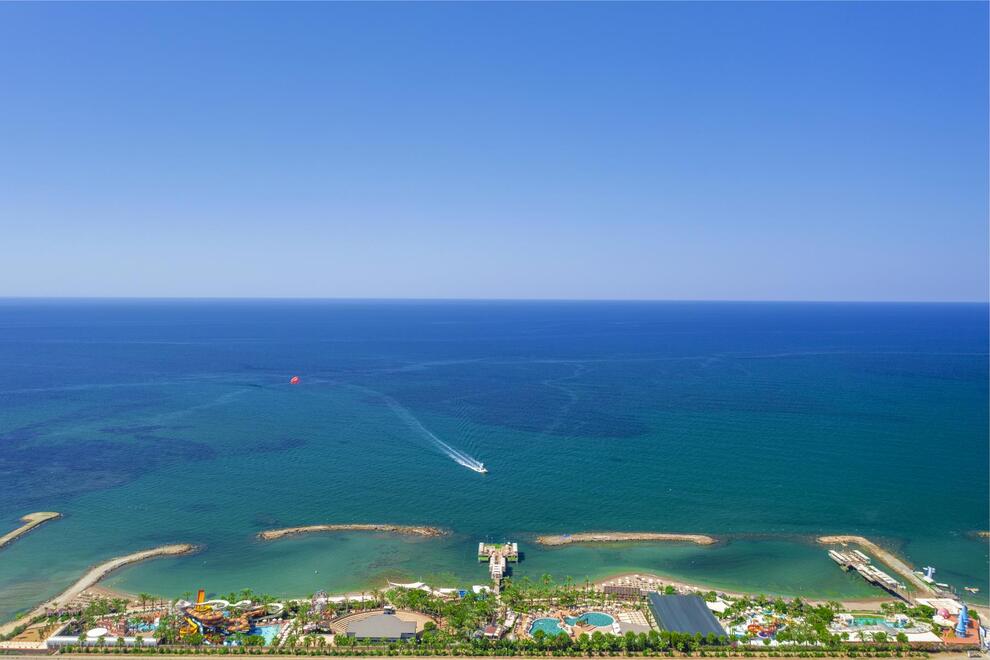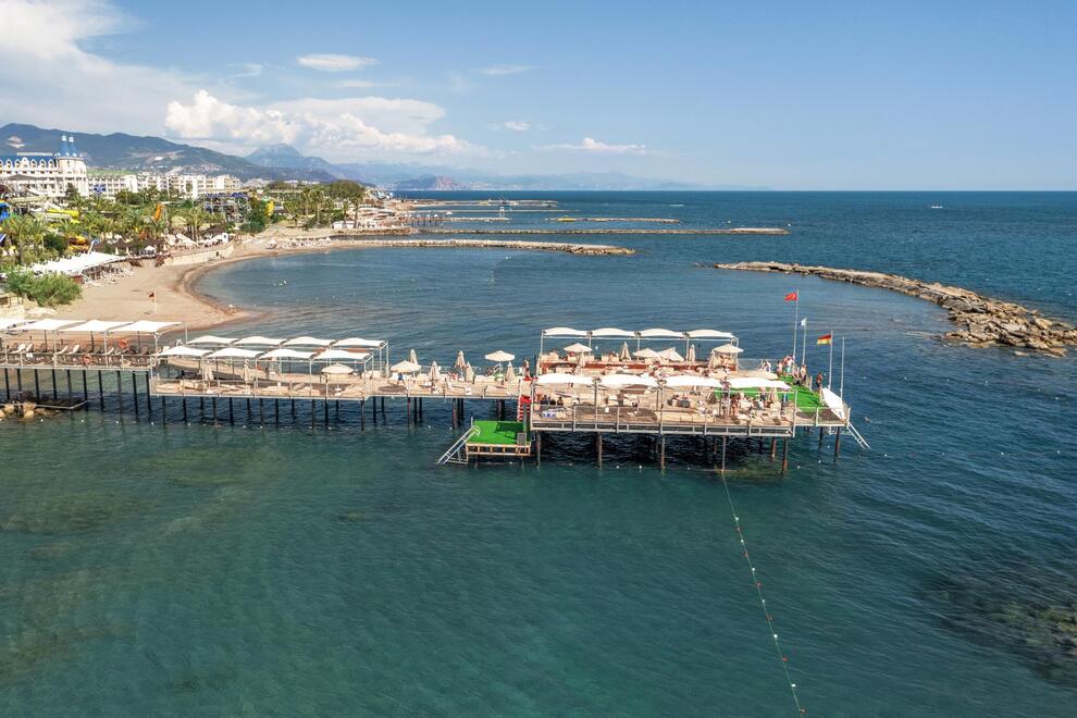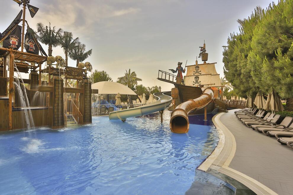 Хотелът разполага със собствен пясъчен плаж с кей. Има 6 открити и 1 закрит басейн, 8 водни пързалки. Чадъри, шезлонги и матраци на плажа и при басейна – безплатно. Плажни кърпи - срещу карта, която се издава при настаняване.