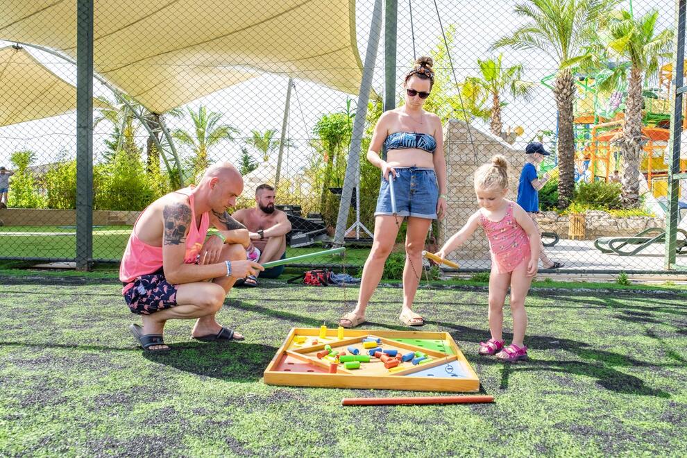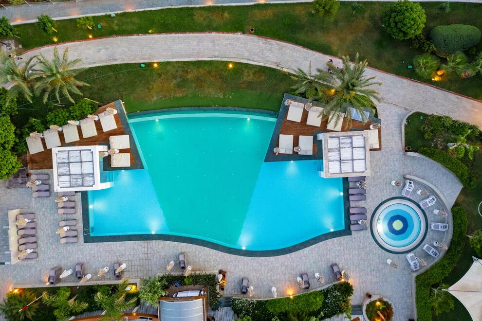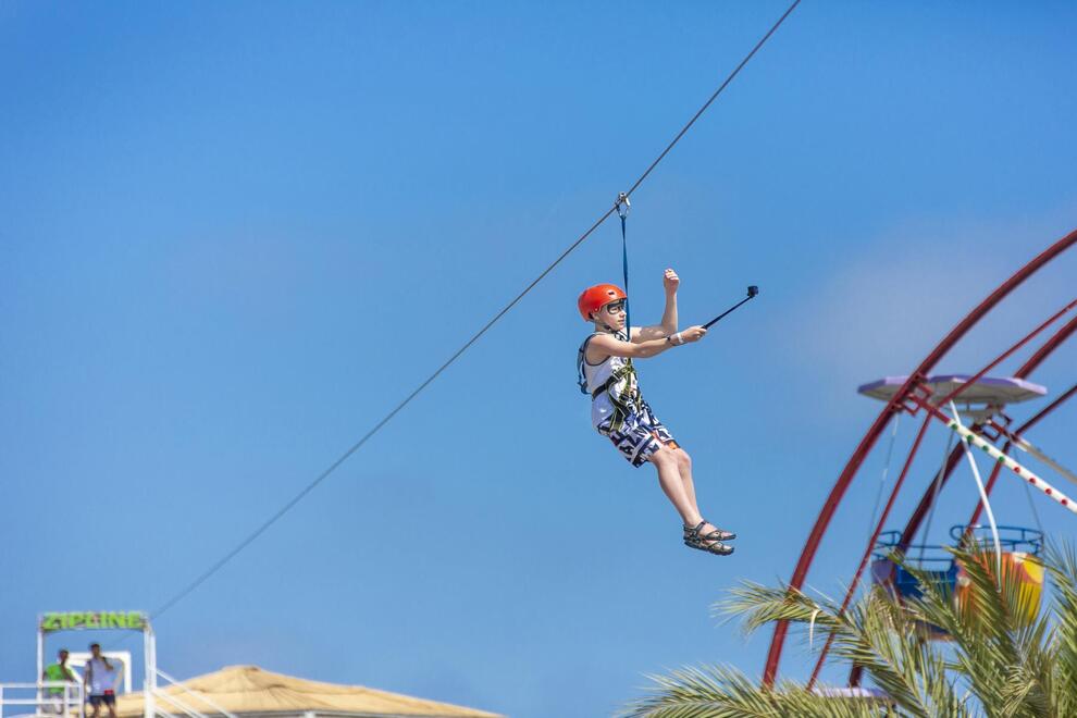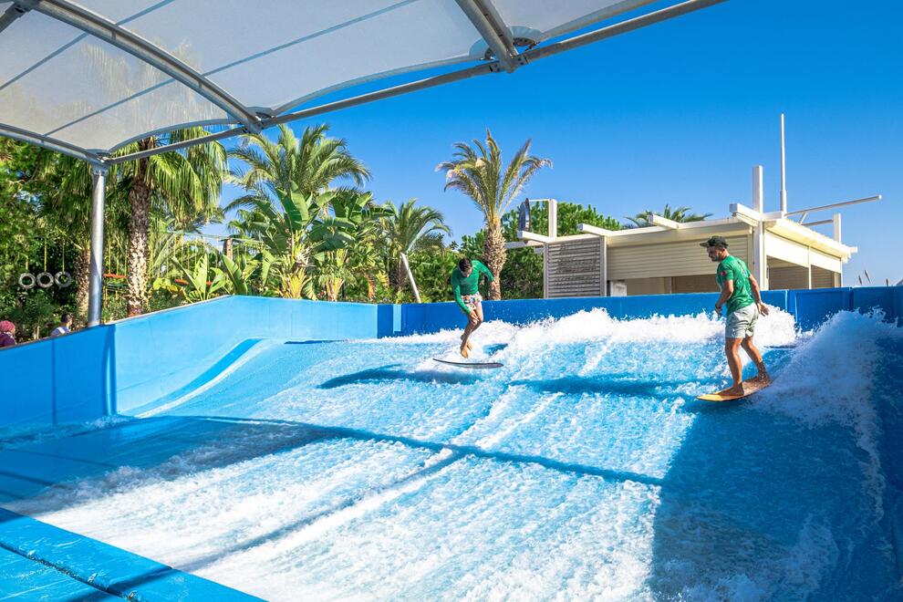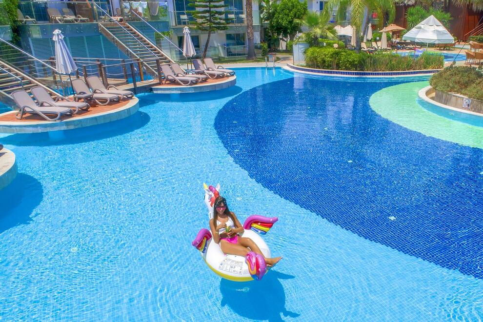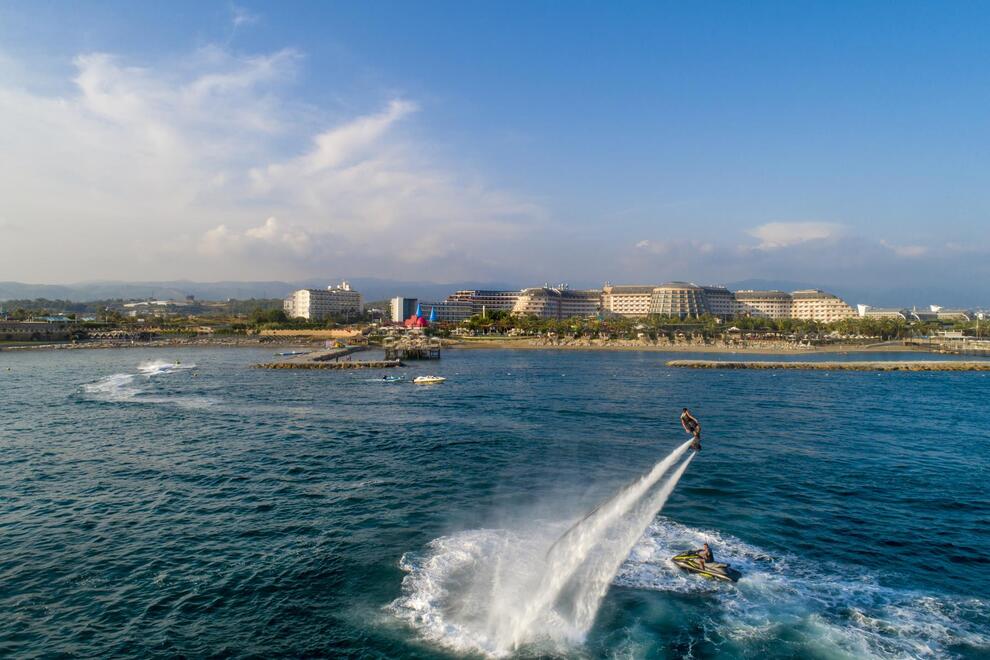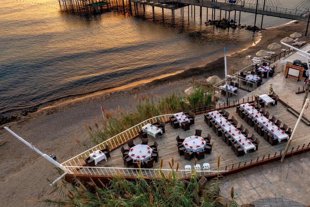 Хотелът разполага със собствен пясъчен плаж с кей. Има 6 открити и 1 закрит басейн, 8 водни пързалки. Чадъри, шезлонги и матраци на плажа и при басейна – безплатно. Плажни кърпи - срещу карта, която се издава при настаняване.