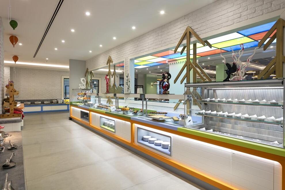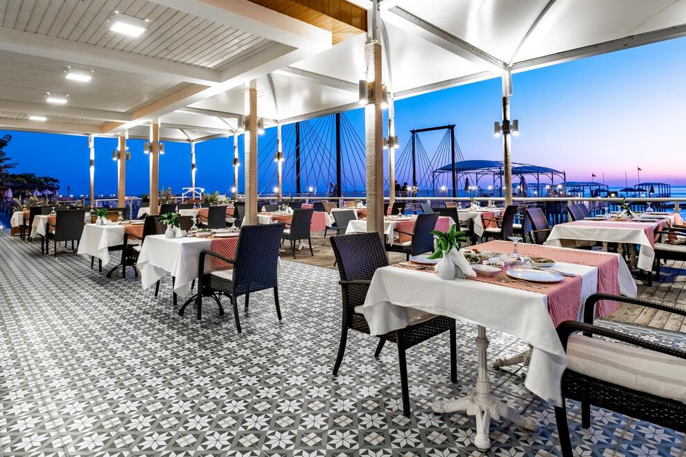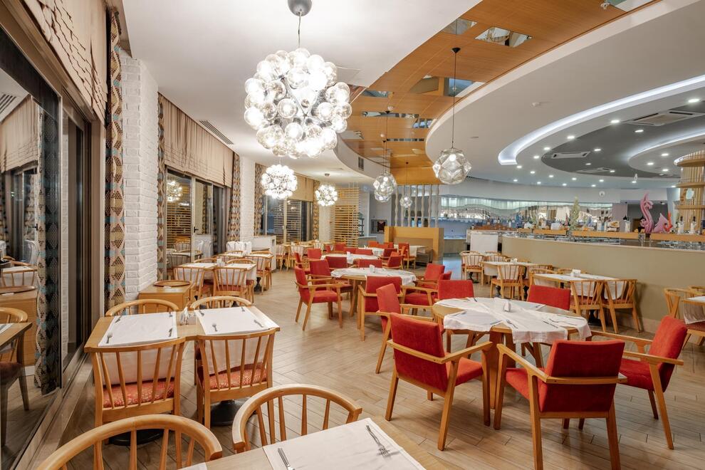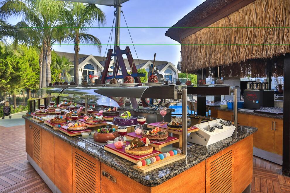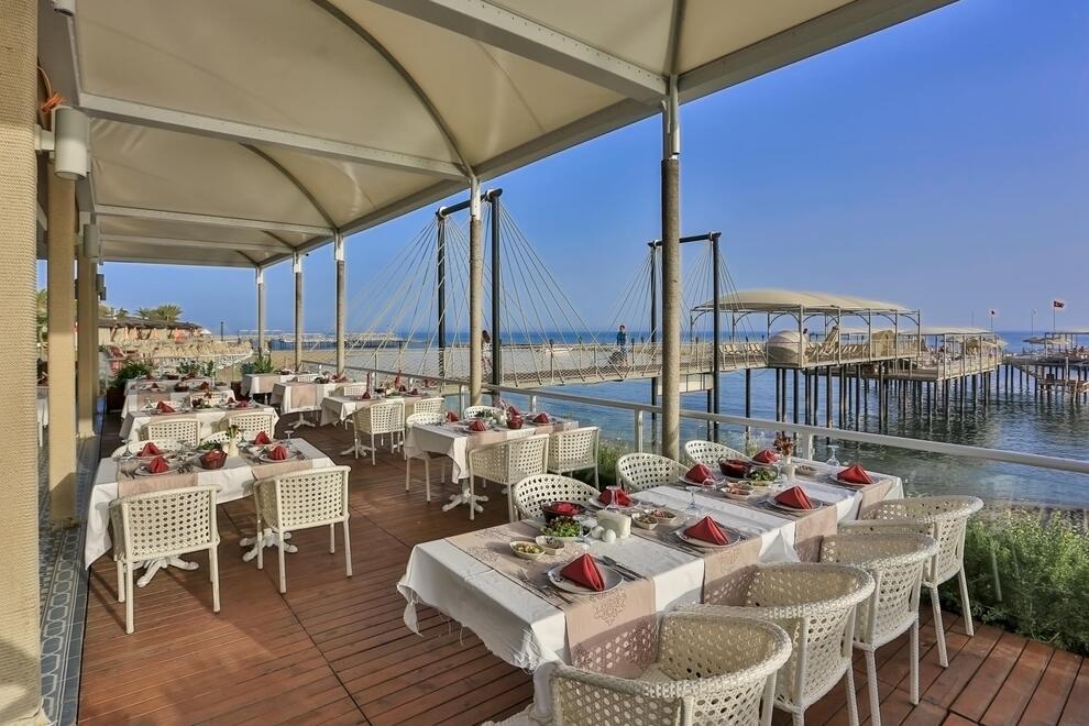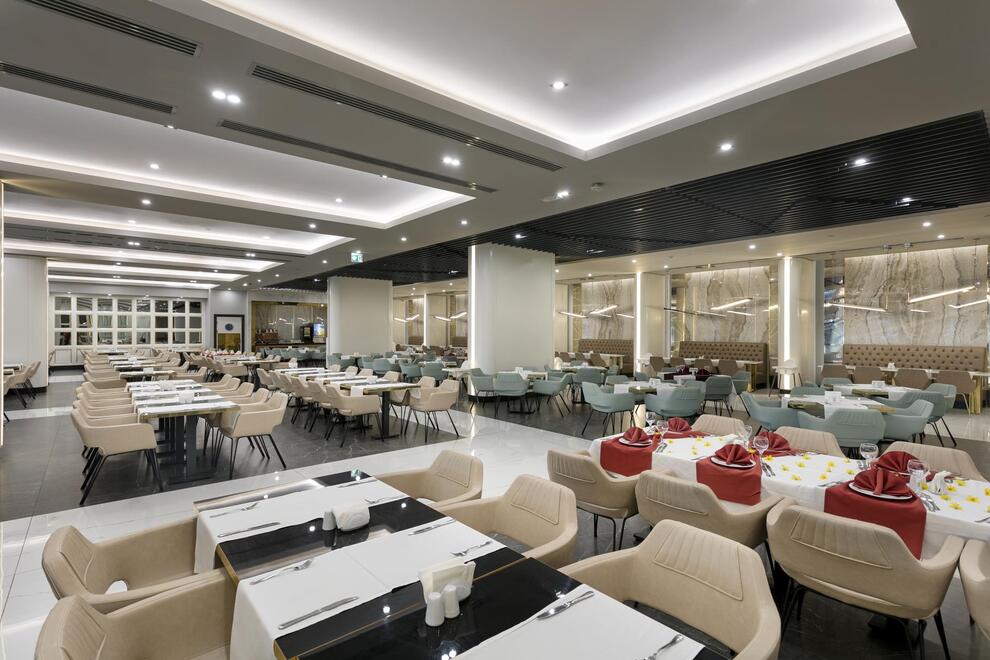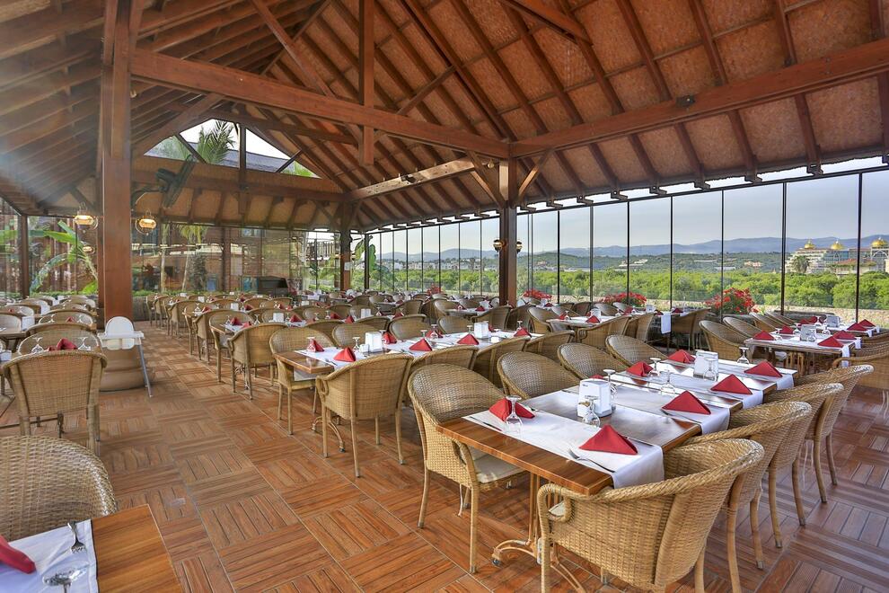 Основен ресторант, 5 а`ла карт ресторанта (по предварително записване - безплатно веднъж по време на престоя). Китайска, турска, италианска кухня и рибен ресторант, 5 бара. Хранене Ultra All Inclusive – закуска, обяд, вечеря и междинни хранения на шведска маса, местни и някои вносни алкохолни и безалкохолни напитки без лимит.