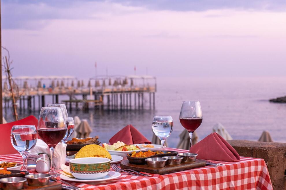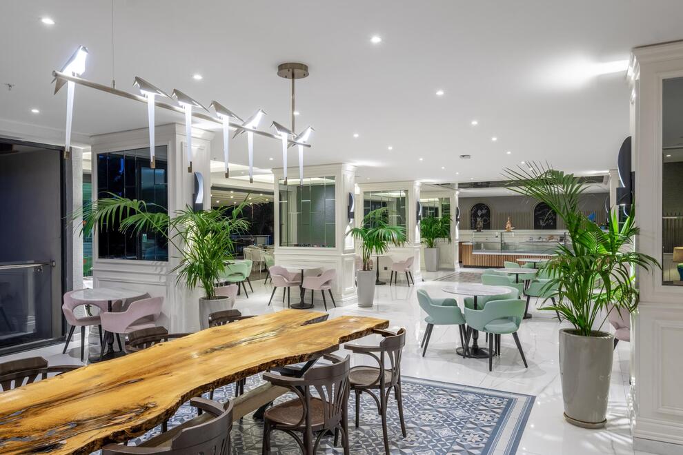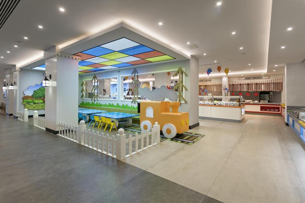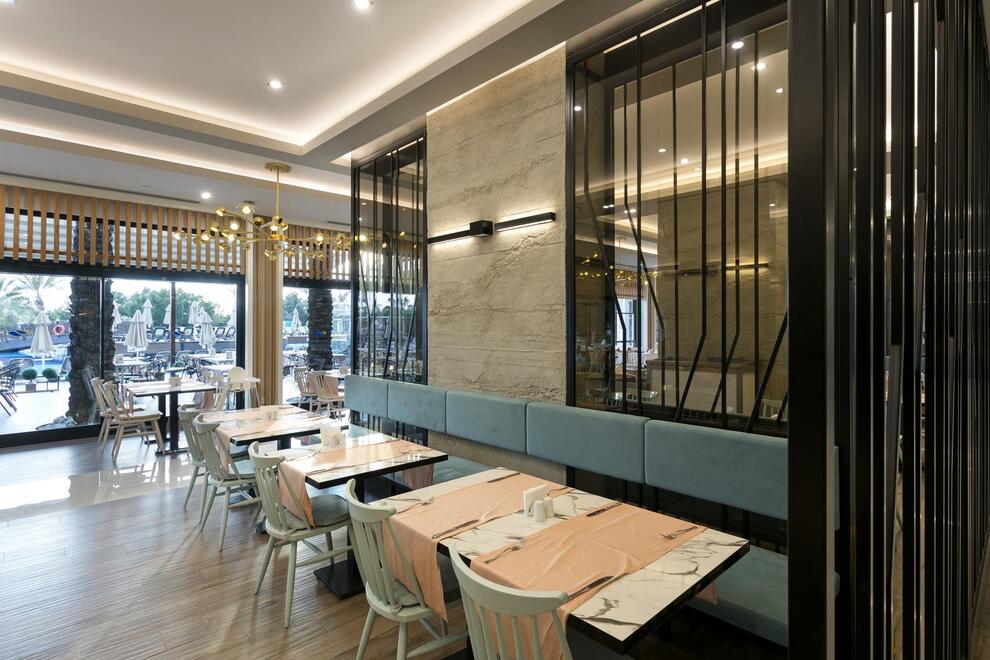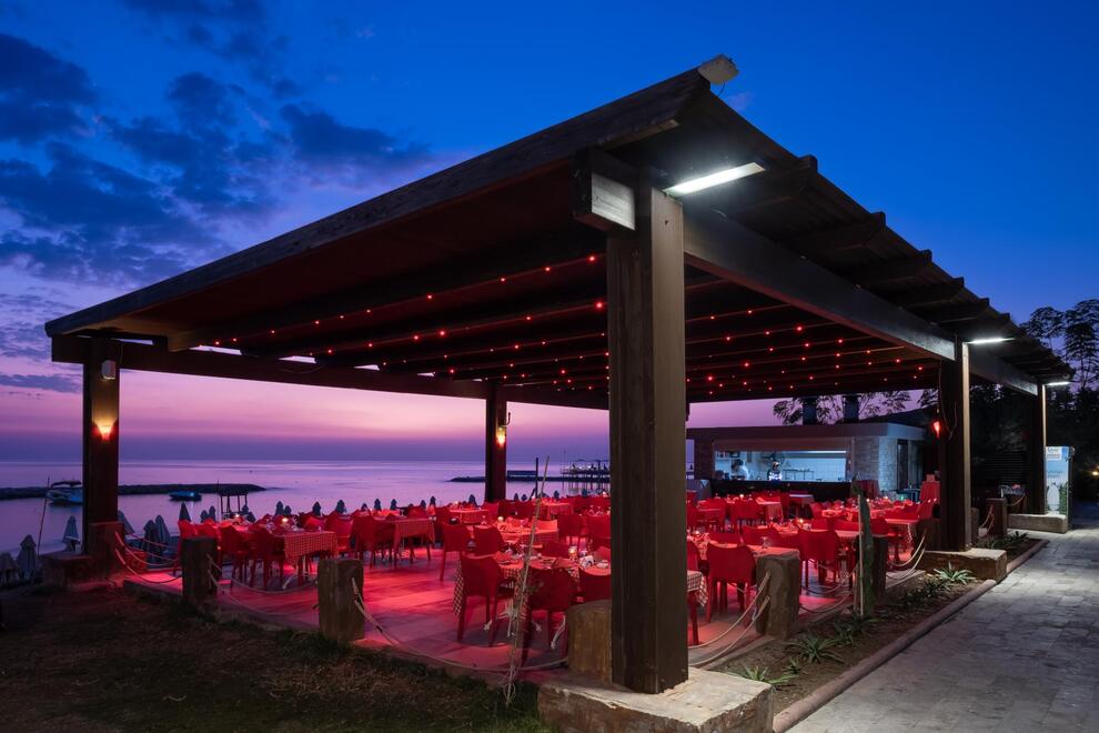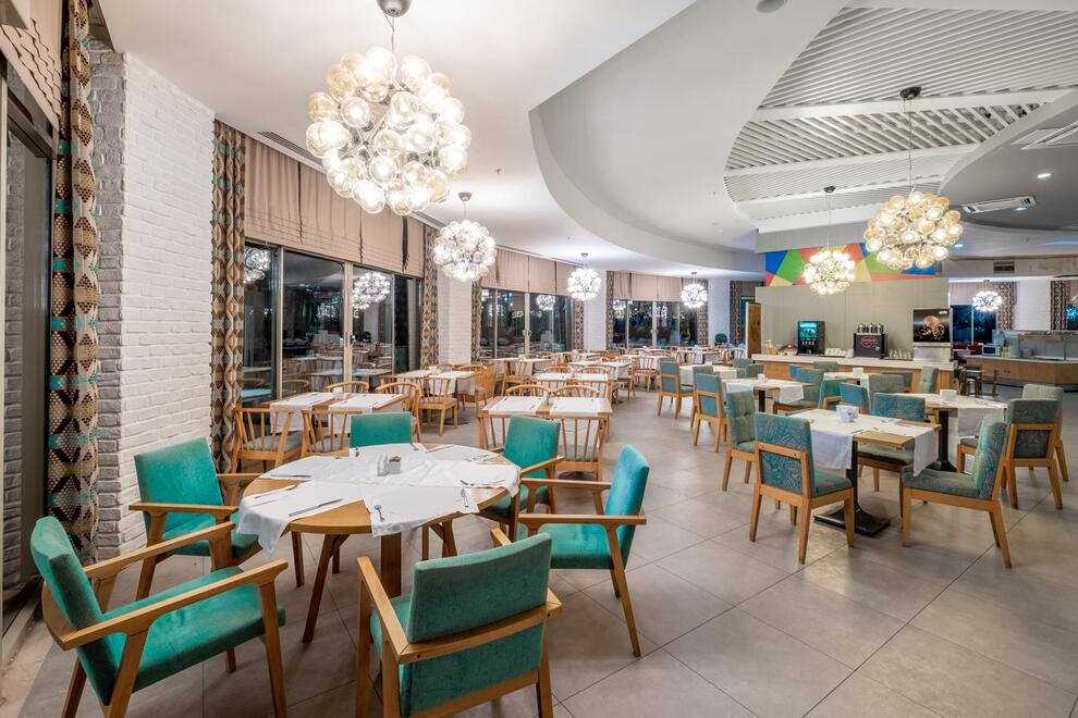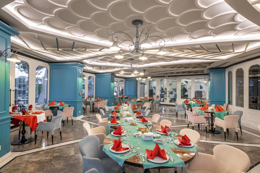 Основен ресторант, 5 а`ла карт ресторанта (по предварително записване - безплатно веднъж по време на престоя). Китайска, турска, италианска кухня и рибен ресторант, 5 бара. Хранене Ultra All Inclusive – закуска, обяд, вечеря и междинни хранения на шведска маса, местни и някои вносни алкохолни и безалкохолни напитки без лимит.