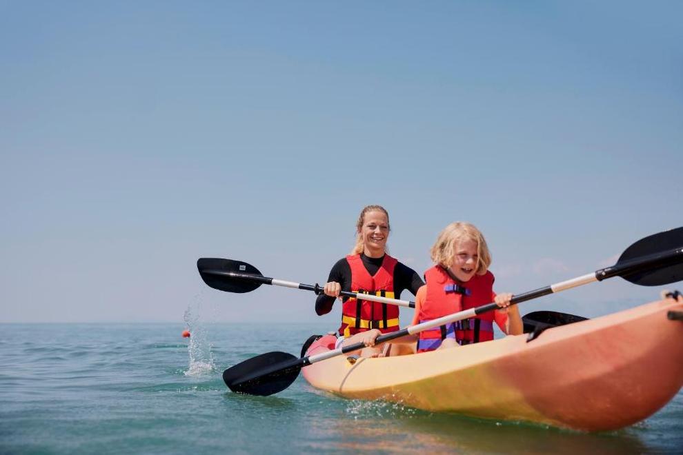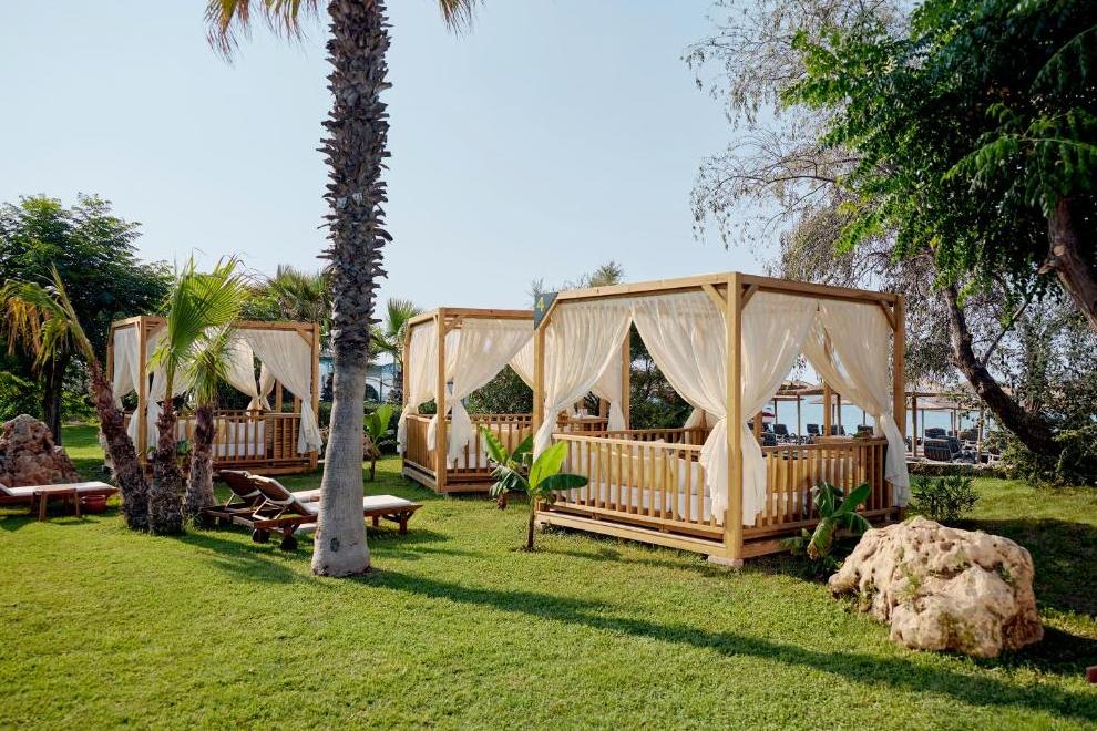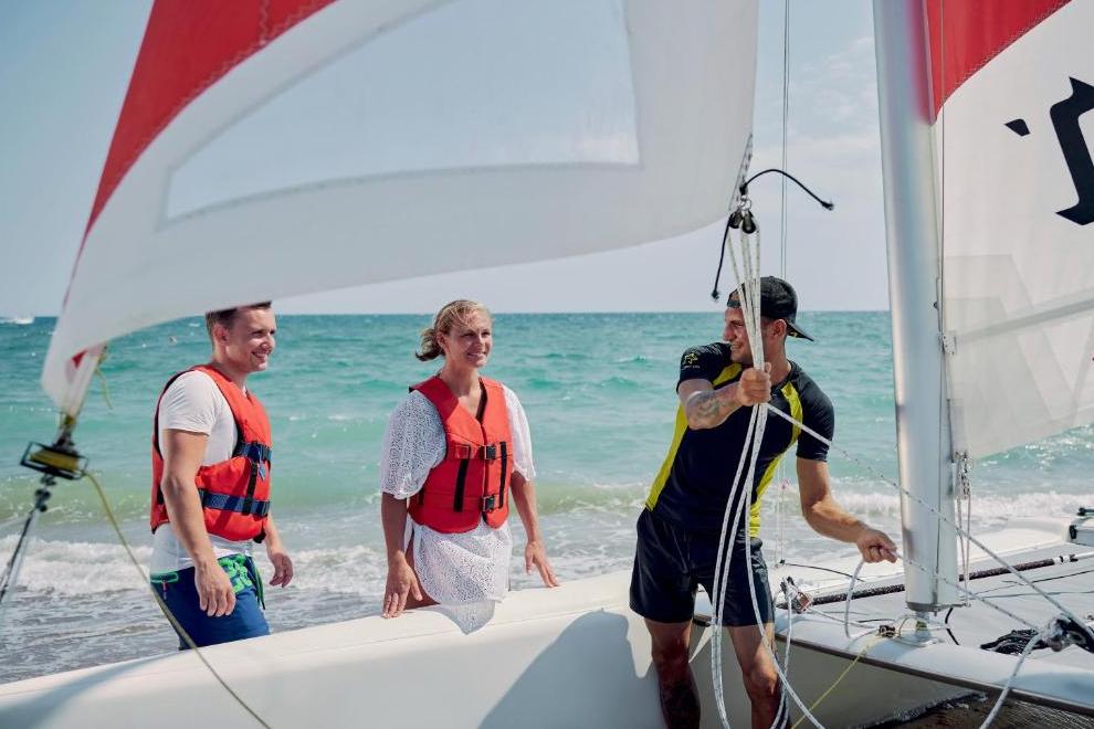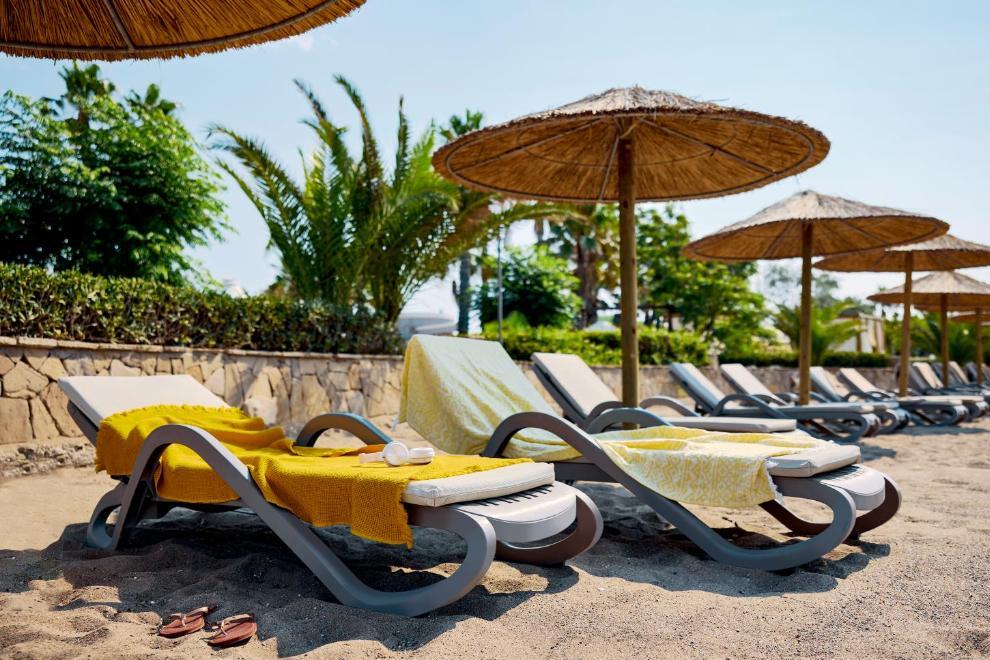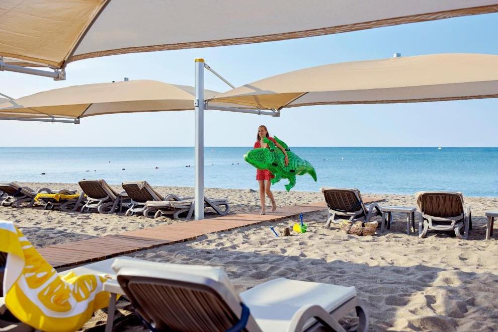 Собствен пясъчен плаж, дълъг 250 м и кей с площ 400 кв.м. 3 открити басейна - активити, релакс и басейн на плажа. Аквапарк за възрастни с 4 водни пързалки, детски аквапарк с 5 водни пързалки. Чадъри, шезлонги, матраци и плажни хавлии на плажа и при басейна се предоставят безплатно.