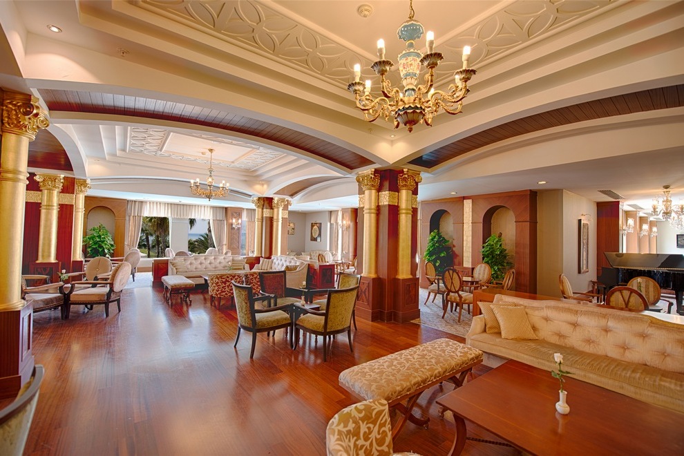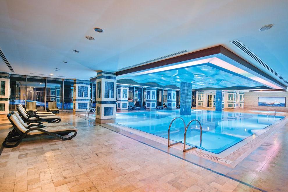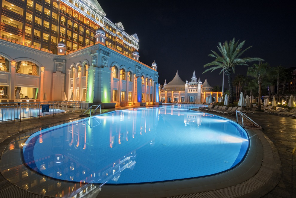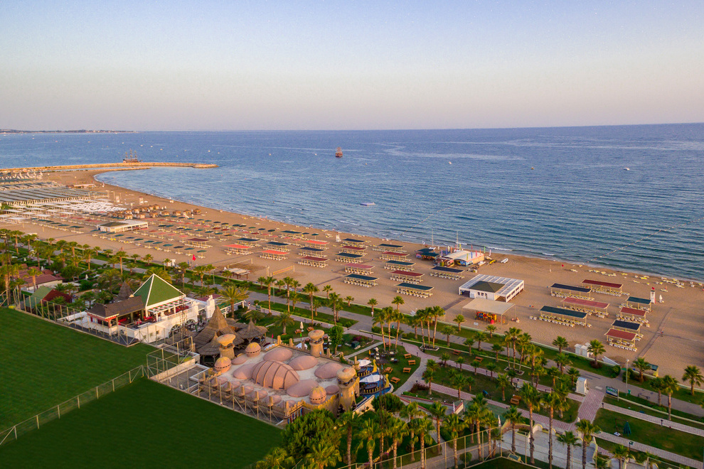 Хотелът има собствен плаж, който е един от най-големите и широки в района на Сиде със своята дължина от 500 метра и ширина от 60 метра. На плажа има 2 бара, единият от които функционира като винарна в периода от началото на май до края на октомври. За удобство на гостите има и 2 открити басейна (в комплекса има 12 басейна), неотопляеми. 1 закрит басейн (в комплекса има 2 басейна), отопляем през студения сезон. 6 водни пързалки, работещи в зависимост от метеорологичните условия. На плажа и при басейна чадъри, шезлонги, матраци и плажни кърпи се ползват безплатно.
