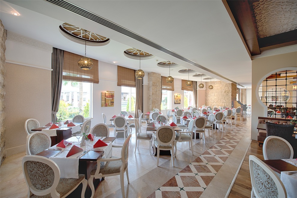 Хотелът разполага с основен ресторант, без открита част, в който се поднася диетична, вегетарианска и Detox храна. Има и 5 а` ла карт ресторанта: турски, китайски, рибен, италиански, турски, мексикански. В 7-те бара се поднасят разнообразни напитки.