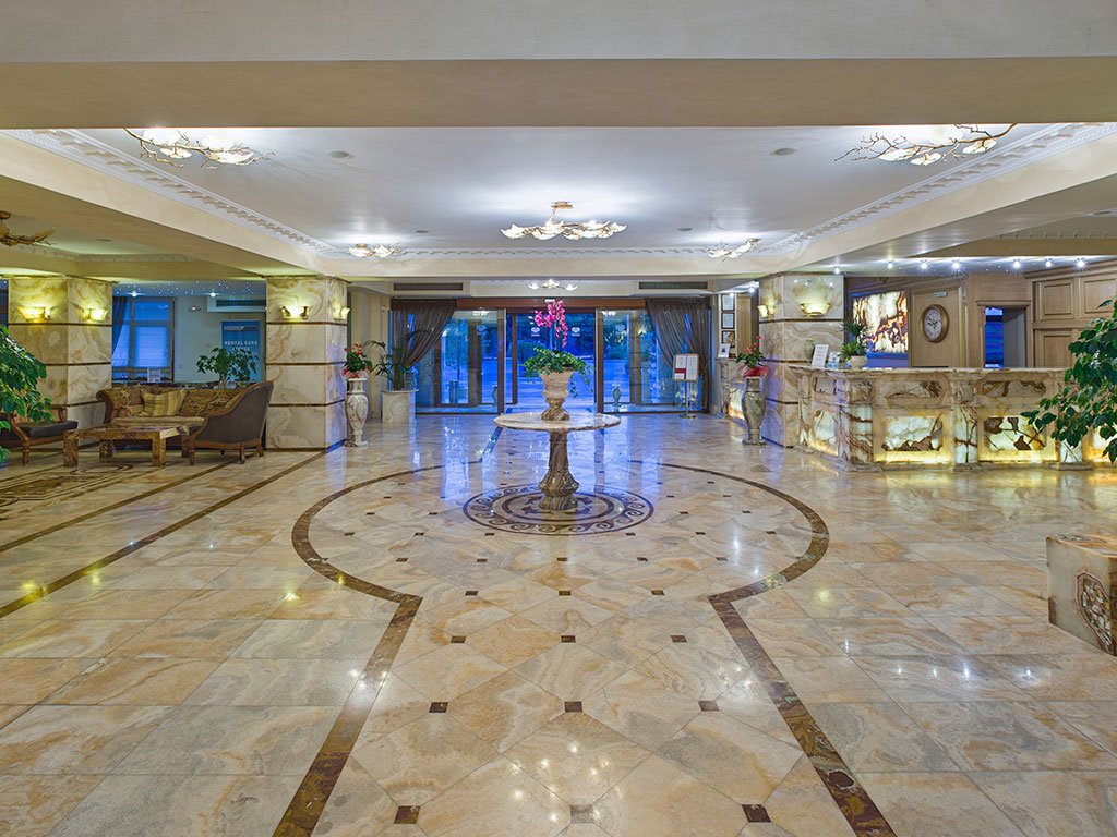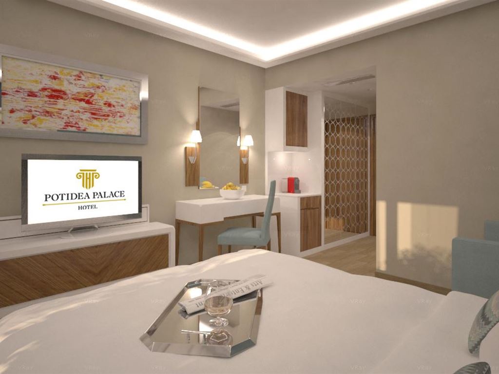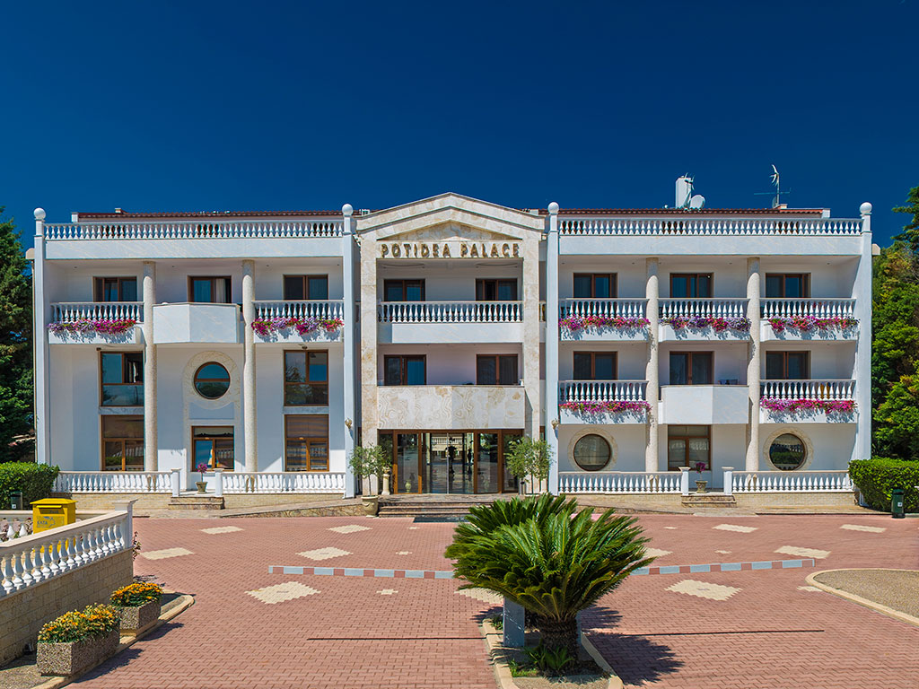 Описание Местоположение Potidea Palace се намира на 57 км от летище "Македония", на 5 км от селището Нея Мудания, на 2 км от селището Потидеа на ръкава Касандра в Халкидики, на брега на морето Настаняване Potidea Palace разполага с общо 232 стаи за гости, разположени в девет двуетажни сгради. Всички стаи са оборудвани с климатик, сателитна телевизия, мини бар, прибори за приготвяне на кафе и чай, сейф, баня с душ, тераса. Храна и напитки Potidea Palace разполага с един основен ресторант и един а'ла карт ресторант "Акрополис", коктейл бар, бар на басейна и бар на плажа. Удобства, спорт и забавления Potidea Palace предлага възможност за отдих и забавления на 1 открит плувен басейн за възрастни и 1 детски басейн, СПА център, солариум, турска баня, джакузи, фитнес зала, 2 тенис корта, мултифункционално игрище, билярд, детска площадка, мини клуб. Предлага възможности за практикуване на водни спортове, плажен волейбол, тенис на маса. Вечер се организират развлекателни програми. Wi-Fi интернет е наличен на територията на целия хотел без заплащане. Хотелът разполага с безплатен частен паркинг. Плаж Potidea Palace се намира на собствен пясъчен плаж. Предлага удобството на един открит плувен басейн за възрастни и един детски басейн. Чадъри и шезлонги край басейна и на плажа - безплатно.