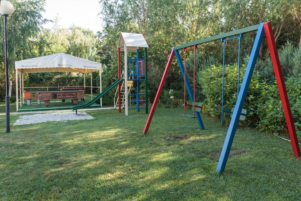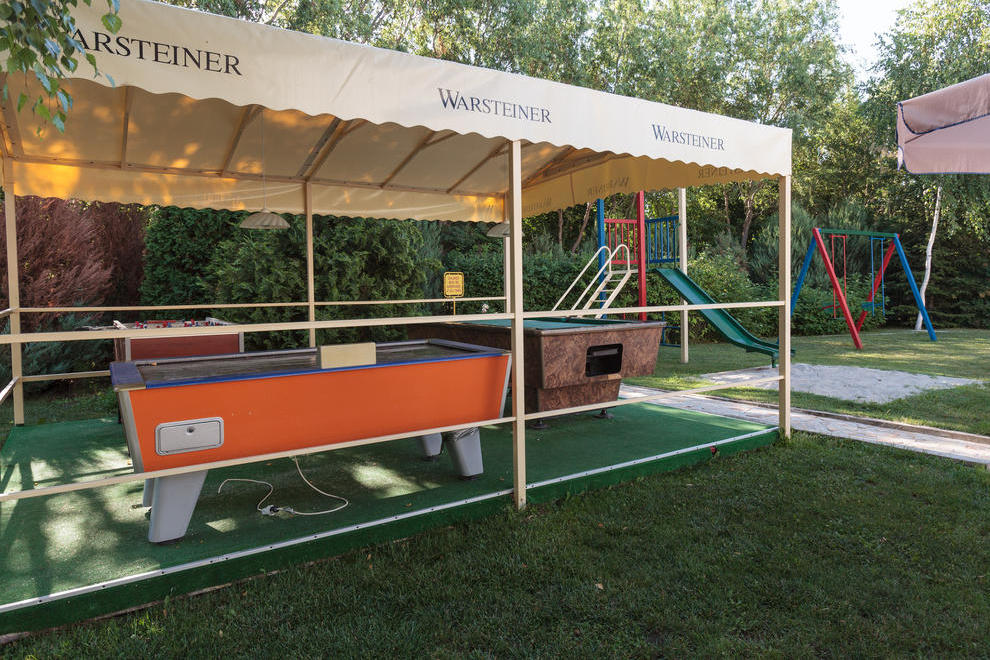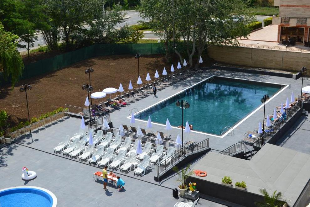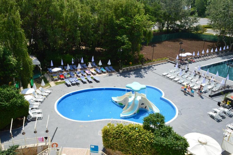 Разполага с голям басейн за възрастни и басейн за деца с водни пързалки.