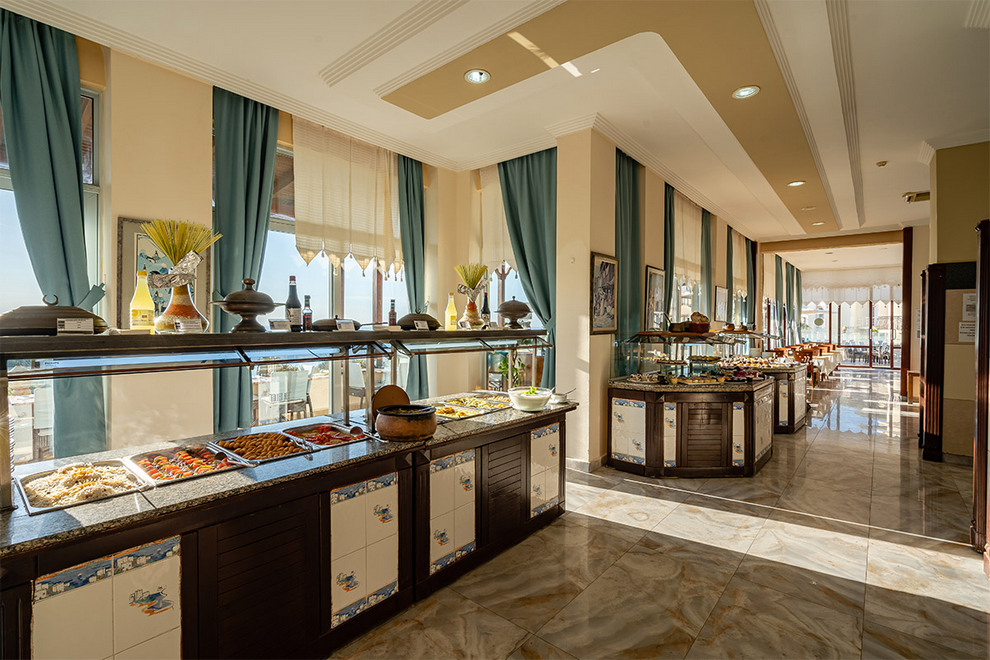На разположение на гостите са основен ресторант с капацитет от 450 човека и 5 бара - снек бар, лоби бар, при басейна и на плажа и кафе - бар