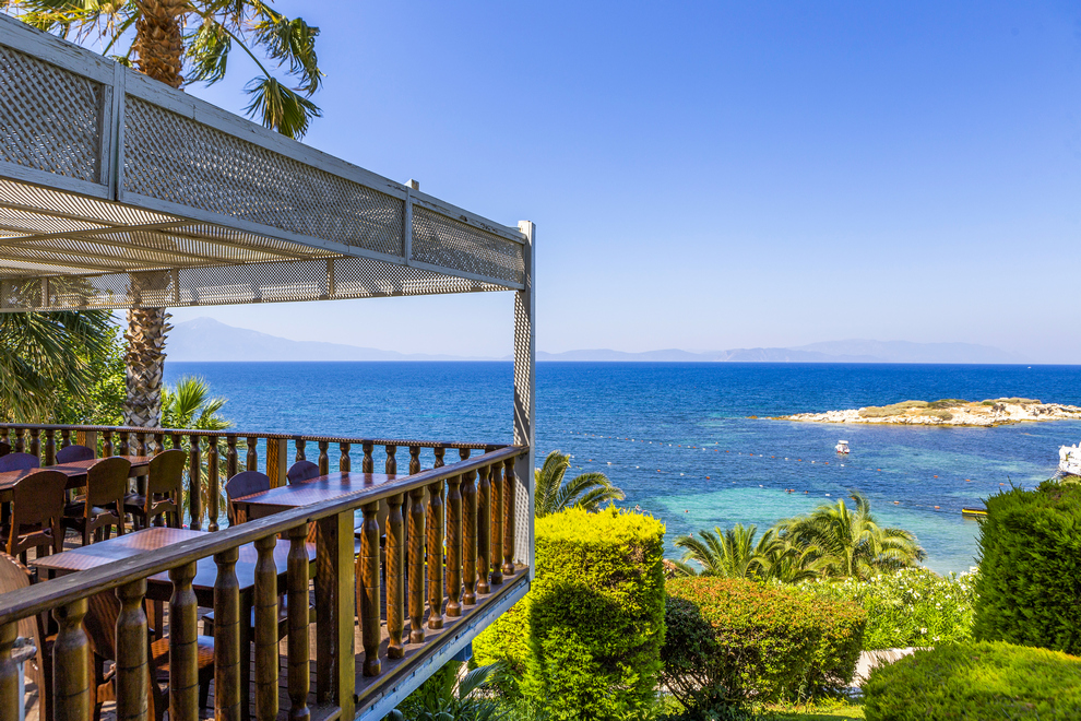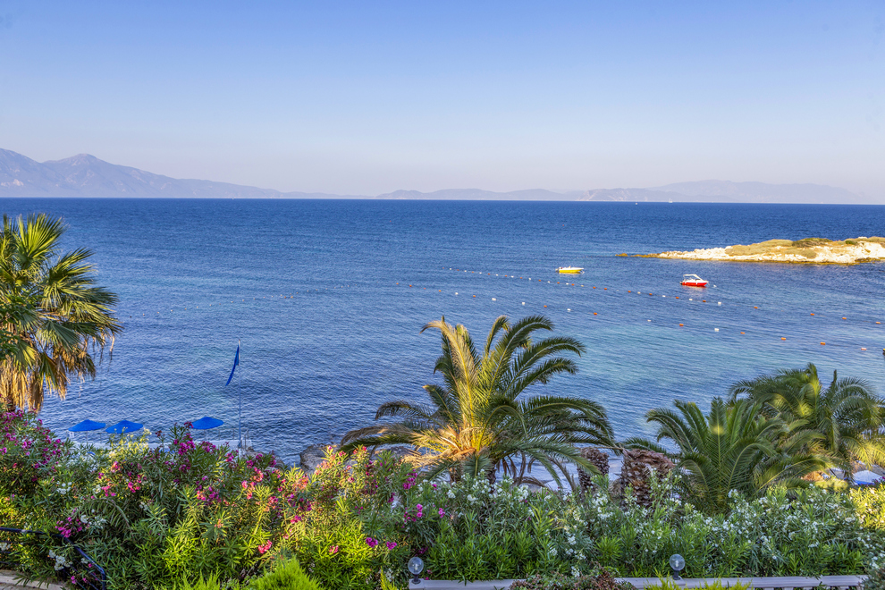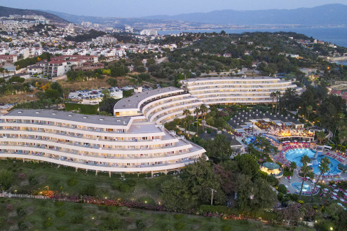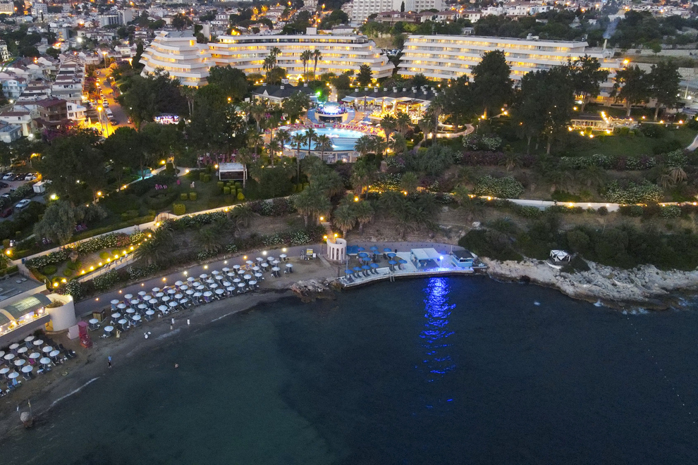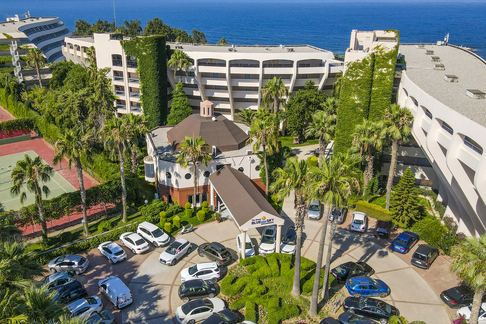 The Grand Blue Sky International Hotel се намира на 75 км от летище Аднан Мендерес, на 3 км от центъра на Кушадасъ, на брега на морето. Последна реновация е направена през 2023 г.