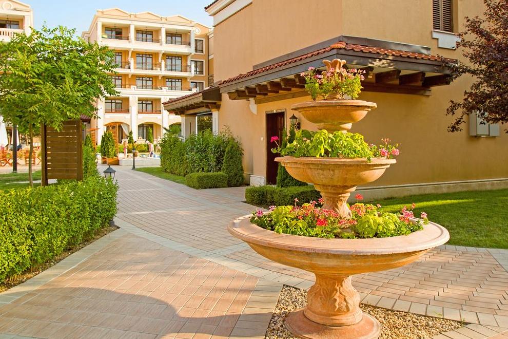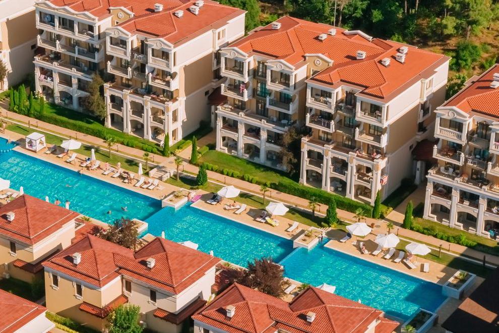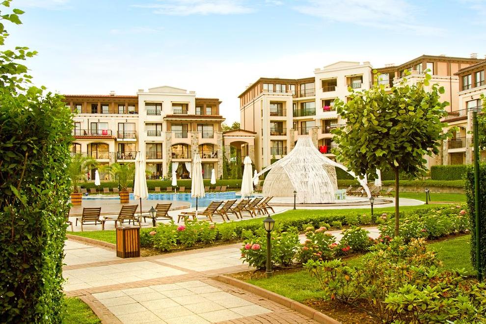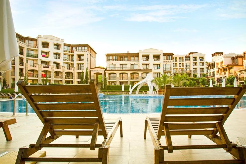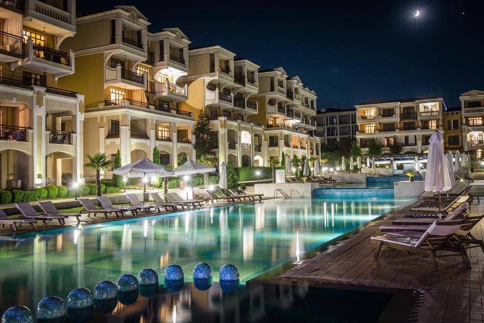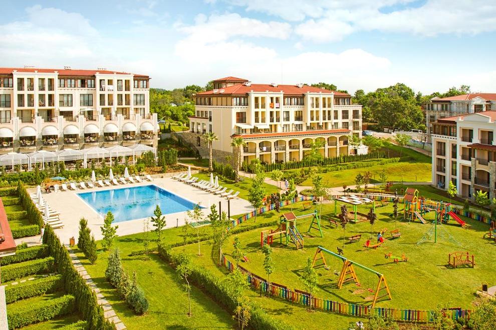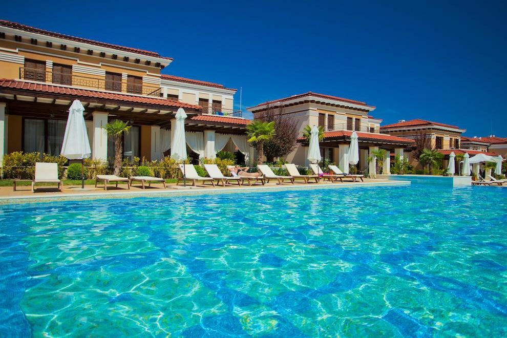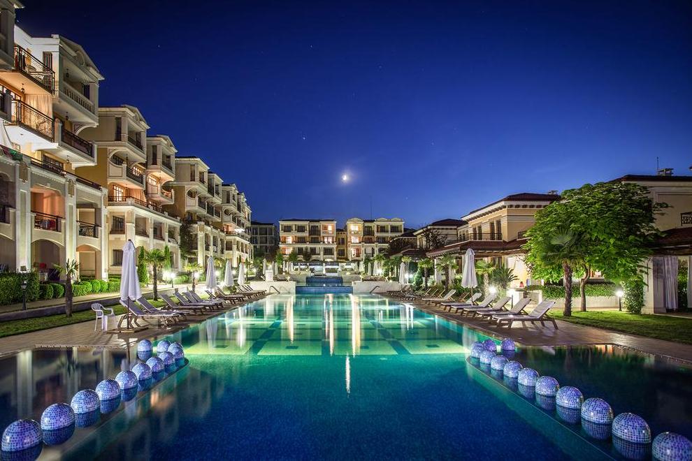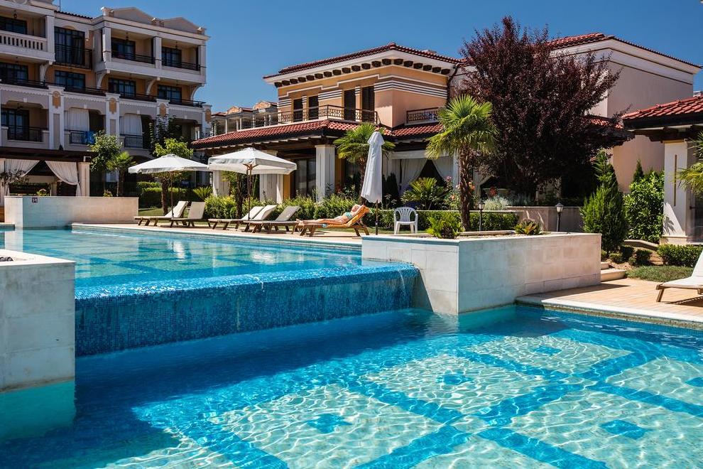 Хотелът е на първа линия и разполага с 4 големи открити басейна, два от които с детска секция, както и с тераса за слънчеви бани.