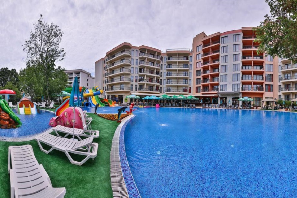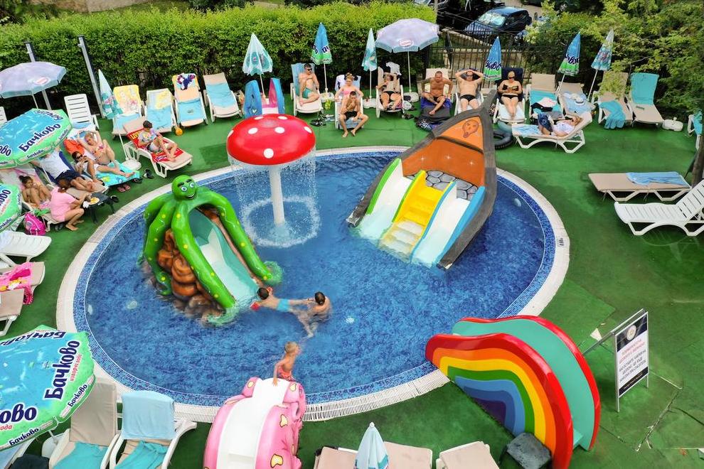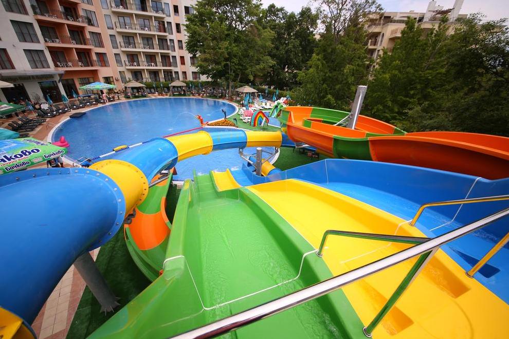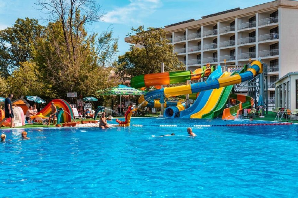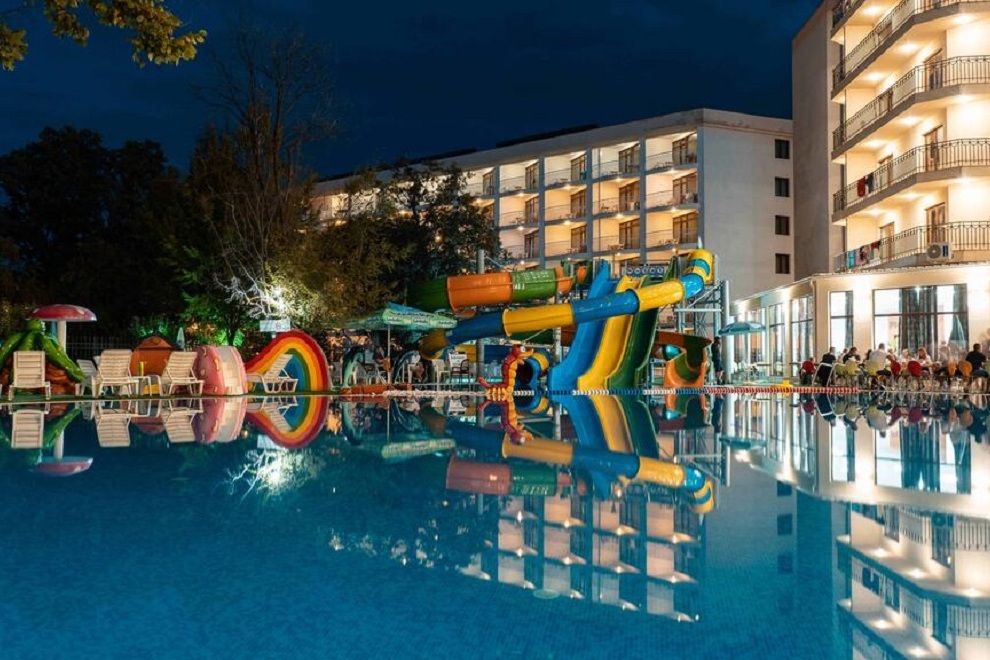 Аквапарк, СПА център – джакузи, фитнес център, сауна, вътрешен отопляем плувен басейн, външни басейни, шезлонги, чадъри, хавлии, Ол инклузив ресторант, Пул бар, Лоби бар, Детски кът, детска площадка с надуваем батут, люлки, игри, Анимация – детска, спортна, вечерна, безплатен интернет, безплатен паркинг.