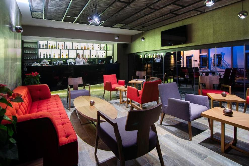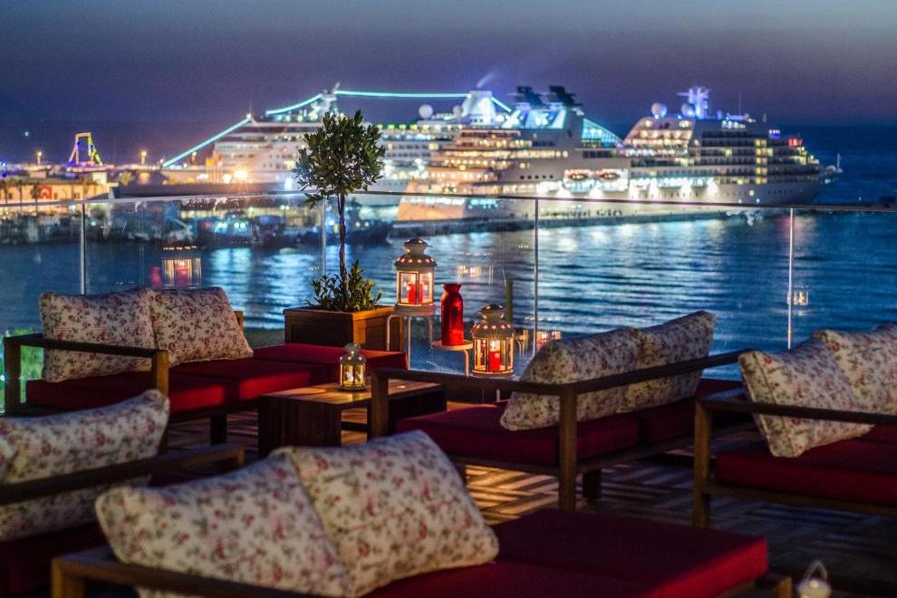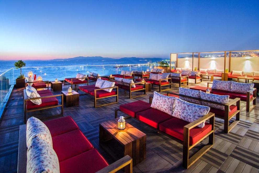 Закуска ресторанта на покрива и тераса с невероятна гледка към Егейско море и града. Ресторант, бар, снек бар.