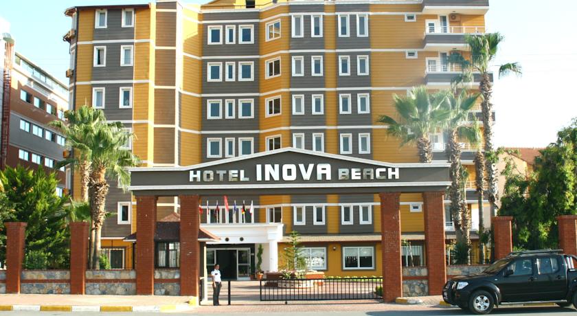 Описание Местоположение Намира се в е в селището Конаклъ,на 12 км от град Алания, на 100 км от летище Анталия. Близо е до центъра на Конаклъ - само на около 200 метра. Хотелът е построен 1994 г. ,като последно е реновиран 2010 г. Настаняване Хотелът разполага със 155 стаи, от които 137 стандартни, 7 фамилни и 11 вили. Светлите стаи на Inova Beach Hotel са оборудвани със сейф, телевизор със сателитни канали и хладилник. Баните включват душ, сешоар и тоалетна. Почистване на стаите и смяна на кърпите – всеки ден, смяна на бельото – 2 пъти в седмицата. Храна и напитки Основен ресторант, 4 бара. All inclusive - закуска, обяд и вечеря на шведска маса, алкохолни и безалкохолни напитки местно производство без лимит. Удобства, спорт и забавления Възможност за активна почивка с плажен волейбол, фитнес център, дискотека, амфитеатър. Аниматорският екип организира занимания през деня и представления всяка вечер. За децата - детски басейн, водни пързалки, мини клуб (4-12 г.), анимация. Плаж Собствен пясъчен плаж пред хотела. Открит басейн, водни пързалки. На плажа и при басейна чадърите, шезлонгите и матраците се предоставят безплатно.