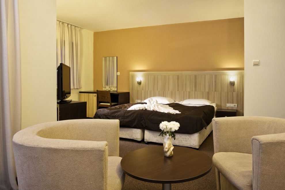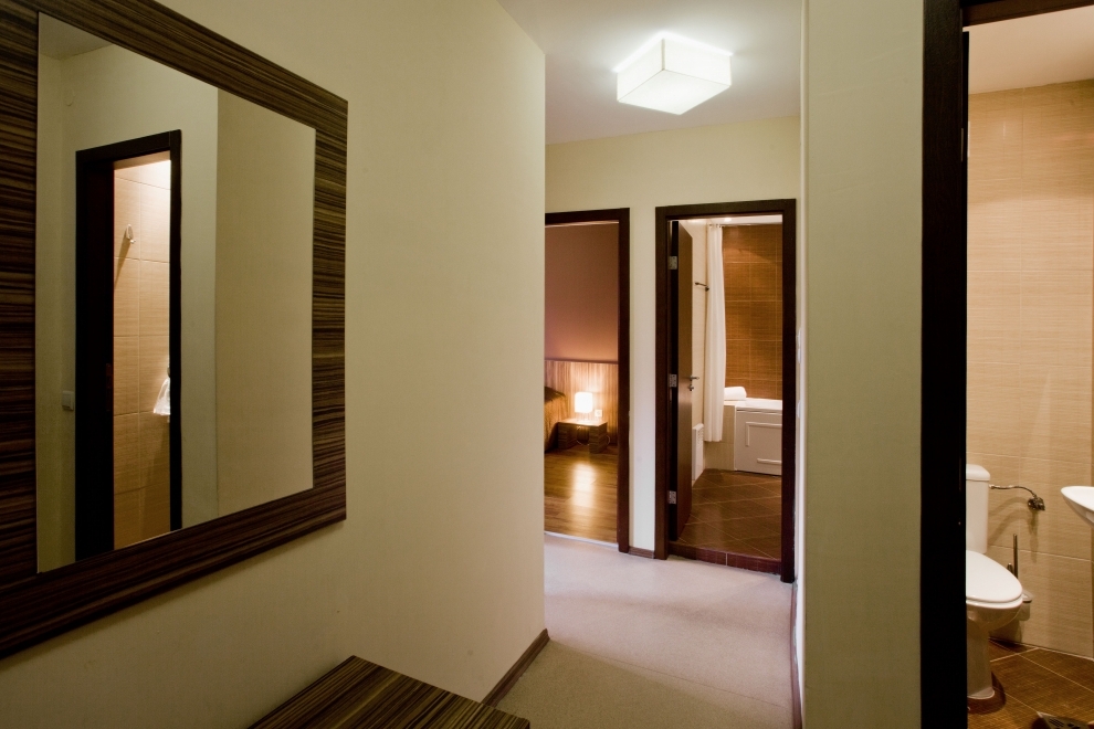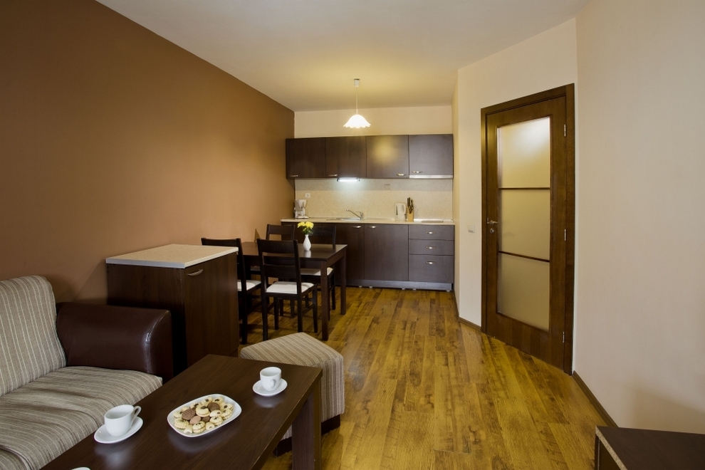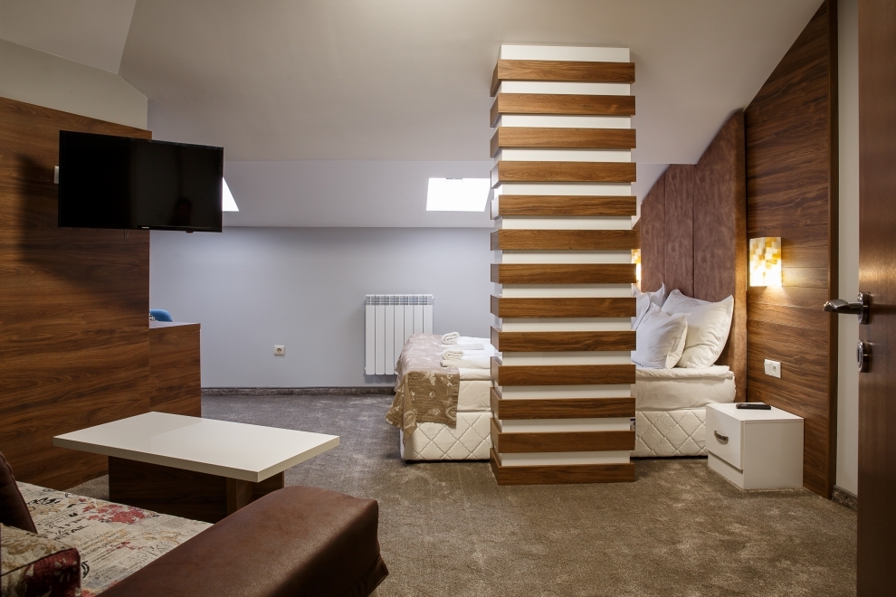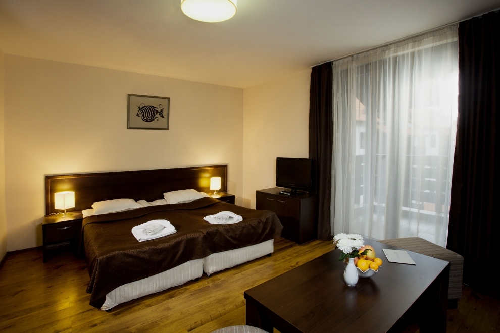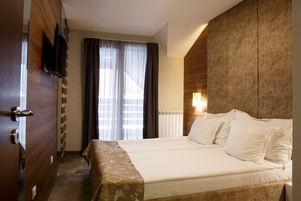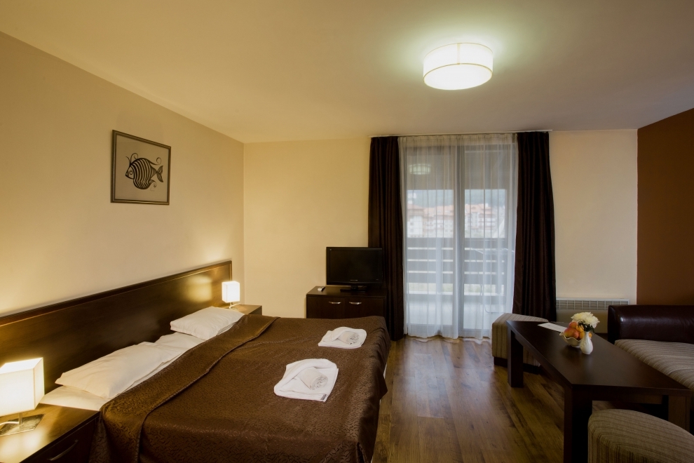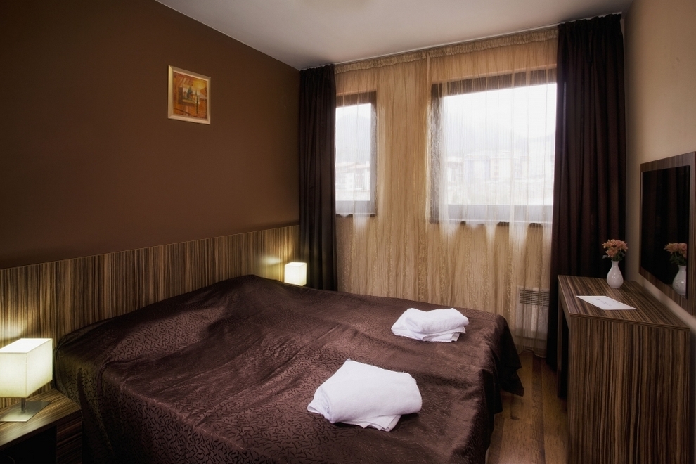 Във всяка двойна стая леглата са тип френски, обзаведени са с портмантo, гардероб, тоалетка със стол и огледало, конвекторен радиатор, LED телевизор, настилката е мокет. Стаите разполагат с луксозно завършени бани с душ кабини с всички необходими аксесоари в тях. По голямата част от помещенията имат балкон с изглед към града и планината. Апартаментите се състоят от всекидневна с мека мебел и напълно обзаведен кухненски бокс, отделна спалня и баня. В по-голямата част от тях има вани в баните, а в някои душ кабини. Почти всички апартаменти имат балкон с гледка към планината или града. Студията се състоят от спалня с напълно обзаведен кухненски бокс и кът с мека мебел. В по-голямата част от тях има вани в баните, а в някои душ кабини. Почти всички студия имат балкон с гледка към планината или града. Луксозно и модерно обзаведен двуспален апартамент с две двойни легла, просторна всекидневна с мека мебел и кът за сядане, портмантo, гардероб, тоалетка със стол и огледало, конвекторен радиатор, LED телевизор, настилката е мокет. Апартаментите разполагат с луксозно завършени бани с душ кабини и с всички необходими аксесоари в тях.