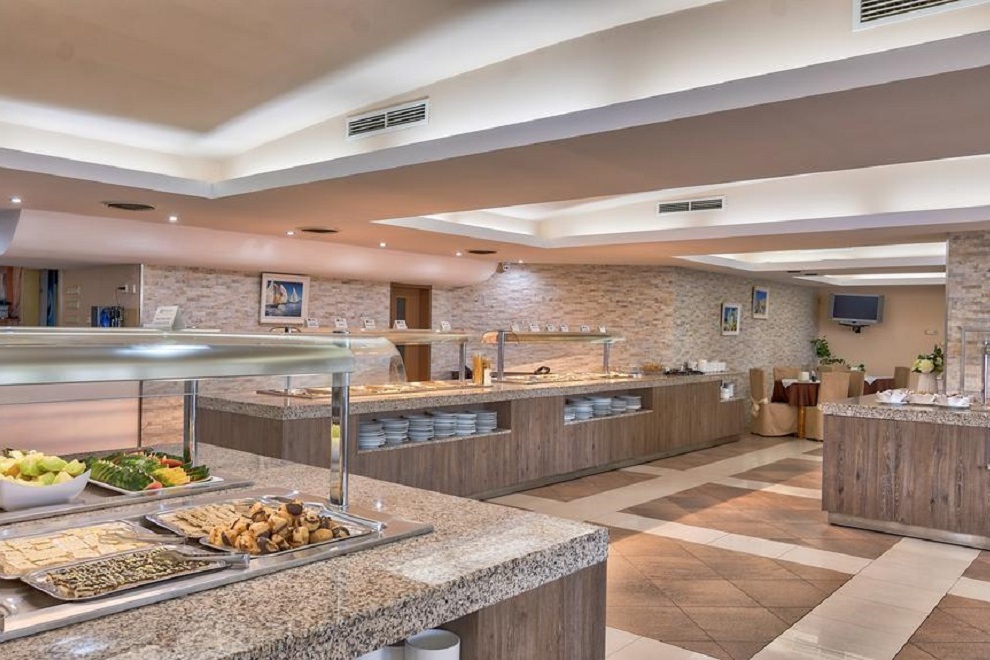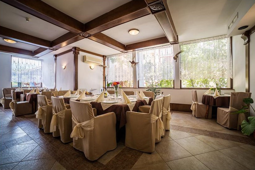Хотелът има основен ресторант, разполагащ с 300 места. Има също кафене с тераса, лоби бар, външен басейн с коктейл бар. Работно време на ресторанта: Закуска на блок маса от 07:30 до 10:00 часа; Късна закуска: от 10:00 до 11:00 часа. Обяд на блок маса: от 12:30 до 14:30 часа. Следобедна закуска: 16:00 - 17:00 часа - кекс, сладолед. Вечеря на блок маса: от 18:30 до 20:30 часа. Веднъж седмично - италианска вечеря. Веднъж седмично - българска вечеря. Българска шоу програма веднъж седмично (през юли и август) в ресторант. Напитки: от 11:00 до 22:30 часа в ресторант Градина от 11:00 до 18:00 часа в бар басейна Чай, кафе, мляко, вода, алкохолни напитки, сок от диспенсър. Местни алкохолни напитки, бира, вино, водка, джин, мента, шнапс, мастика.