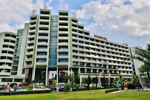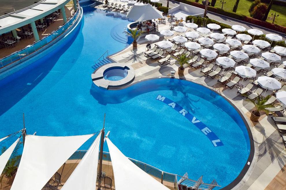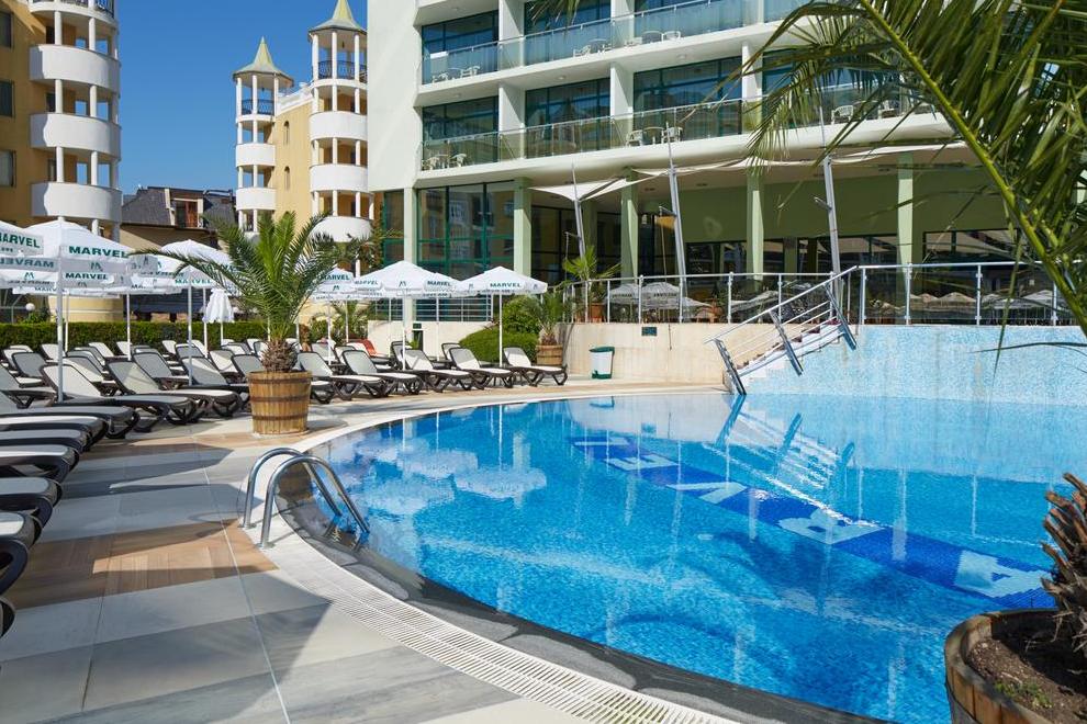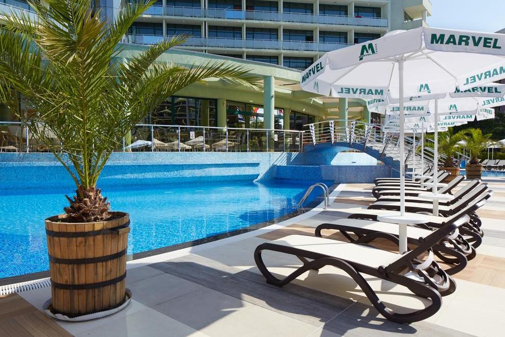 Хотел Марвел разполага със собствена зона на плажа с безплатни чадъри и шезлонги за своите All Inclusive гости /до изчерпване на количествата/. За удобство на гостите има открити басейни и тераса за слънчеви бани.
