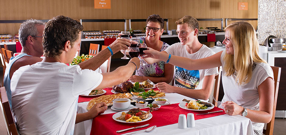 Основен ресторант – международна кухня, открит с тераса, детско меню, бар около басейна (10:00 – 18:30 ч., безплатно), диско бар (денонощно, срещу заплащане), бар „Teracce”.