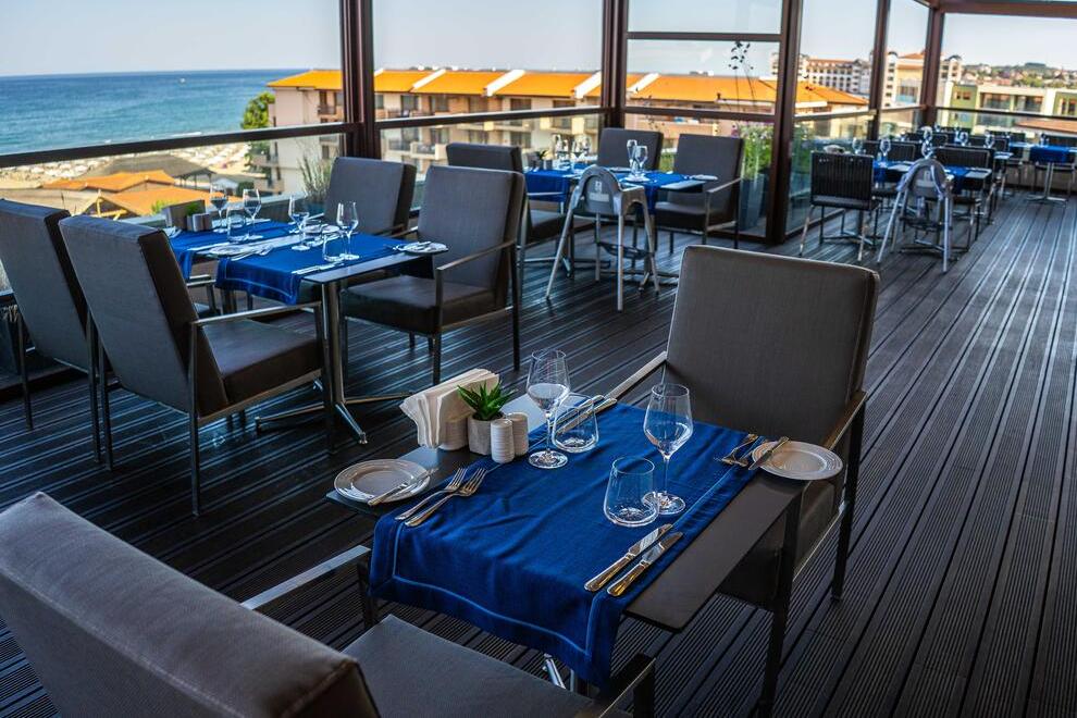 Основният ресторант разполага с просторна и удобна зала, подходяща за настаняване както на двойки, така и на големи групи. За малките гости са предвидени детски столчета и специален детски бюфет. От терасата към ресторанта се разкрива гледка към морето. Пред погледа на гостите готвачите приготвят специалитети както от Българската национална кухня, така и от интернационалната кухня. На богата блок маса се предлагат различни салати, пица и паста, супи, печени меса и зеленчуци, основни ястия, био продукти, бебешки бюфет ( пюрета Нестле Гербер, адаптирано мляко и детски кисели плодови млека Данонино ), огромно разнообразие от десерти, сладолед и различни напитки.Всяка седмица гостите могат да се насладят на различни тематични вечери. Гурме Ресторант " Casa del Chef" предлага изискана гурме кухня на най-високо ниво. Работно време: А`ла карт вечеря от 18:00 ч. до 21:00 ч. Нощен бюфет от 22:00 ч. до 07:00 ч. Може да се направи резервация веднъж на престой във всеки един от а`ла-карт ресторантите на хотела /безплатно/, валидно при престой от минимум 5 нощувки. Изисква се предварителна резервация за вечеря. Резервацията се прави на място в хотела. Ресторант "The Blu" е италиански а`ла карт ресторант на шестия етаж в основната сграда на комплекса, с отворена тераса. Предлага избор от най-изтънчените специалитети от италианската кухня. Работно време: А`ла-карт закуска 10:00 – 11:00 ч., А`ла-карт обяд 12:00 – 15:00 ч., Сладоледени изкушения 15:00 – 17:00 ч.у А`ла-карт вечеря 18:30 – 21:30 ч. Ресторант "Кораб" се намира на брега на морето и предлага средиземноморска и инернационална кухня. Работно време: А`ла карт обяд 12:00 – 15:00 ч., Сладоледени изкупения 15:00 – 17:00 ч., А`ла карт вечеря 18:30 – 21:30 ч. Всяка вечер Снек бара предлага разнообразие от печени на BBQ меса и зеленчуци, поднесени на блок маса. Работно време: Късна закуска: 10:00 – 12:00 ч., Обяд: 12:00 – 15:00 ч., Следобеден снек: 15:00 – 17:00 ч., Вечеря: 19:00 – 21:30 ч.