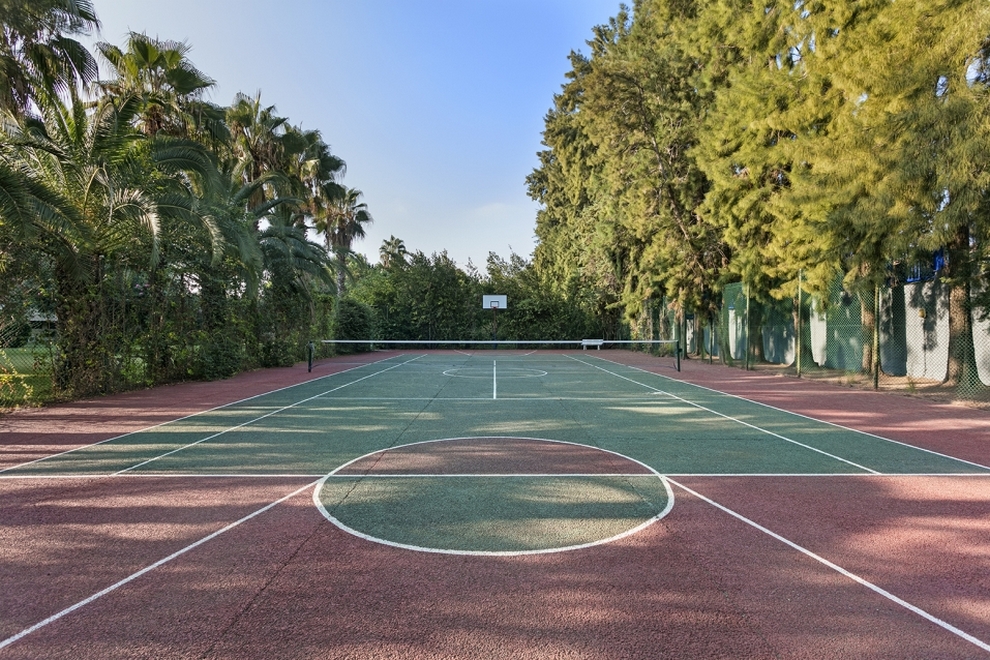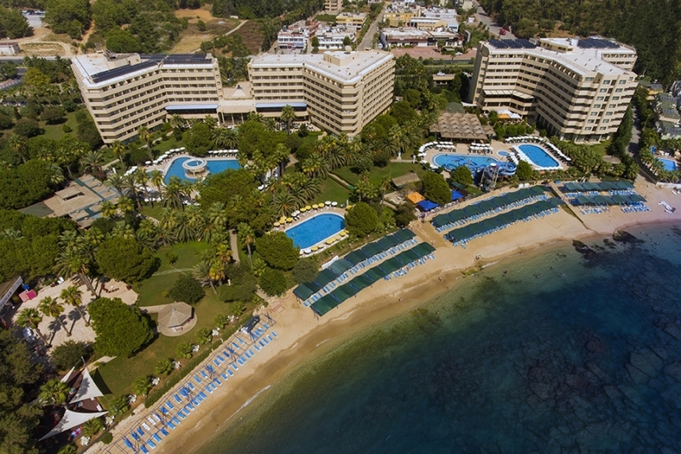 Собствен пясъчен плаж и открити басейни с водна пързалка.