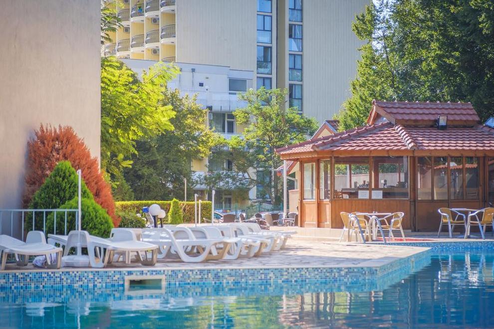 Хотелът е на 300 метра от плажа. Предлага удобството на два басейна и тераса за слънчеви бани.