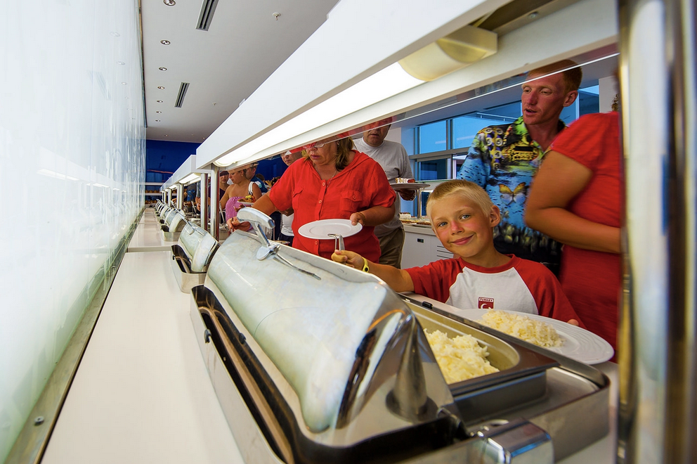На разположение на гостите има основен ресторант с общ капацитет 1200 души, открита тераса за 400 човека, диетично меню, вегетарианска храна, 2 а`ла карт ресторанта (турски и рибен), 9 бара.