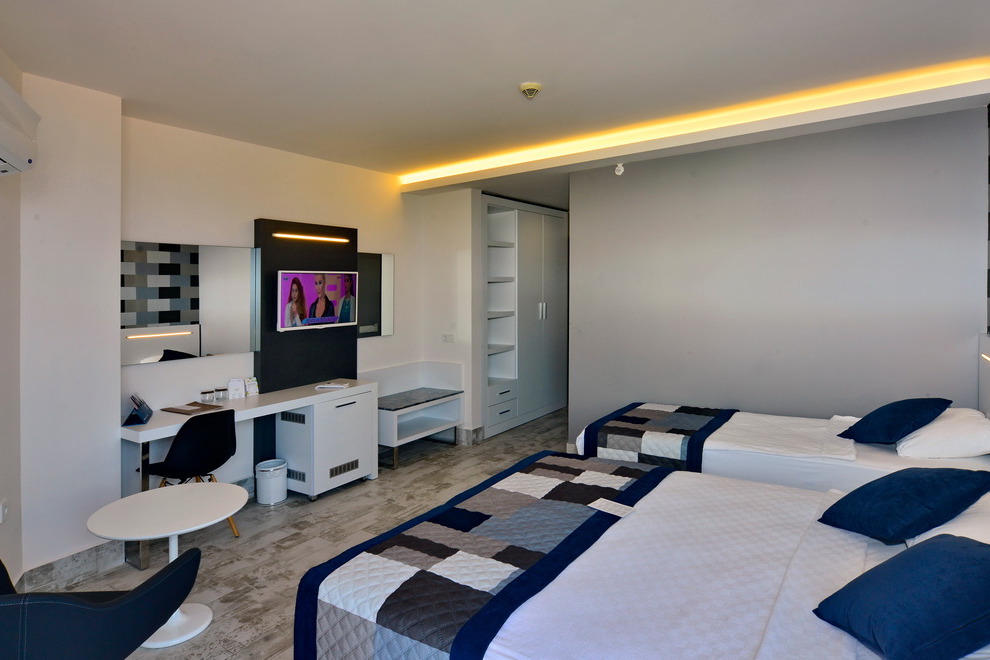Състои се от една основна 6-тажна сграда (има асансьор), в която са разпределени 77 Standard Room Side Sea View (28 кв.м); 33 Superior Room (36 кв.м), 10 Premium Room With Terrace (26 кв.м) и Deluxe Room (30 кв.м). Стаите телевизор, телефон, минибар (платен), сейф (платен), имат баня с вана/душ, сешоар, Wi-Fi. (платен), балкон. Стаите се почистват всеки ден, смяна на спалното бельо - два пъти седмично.