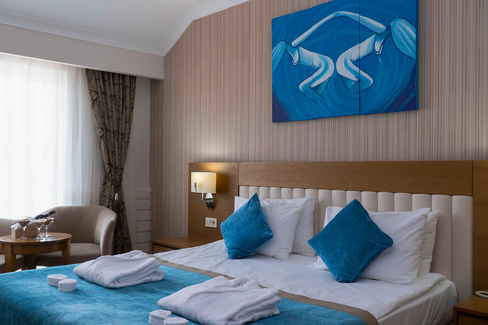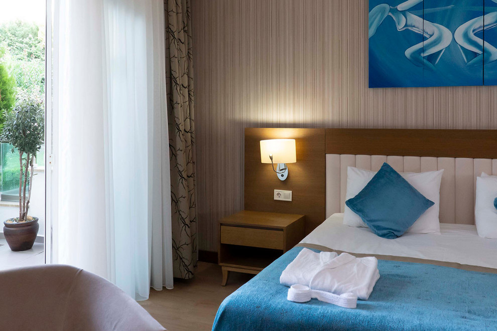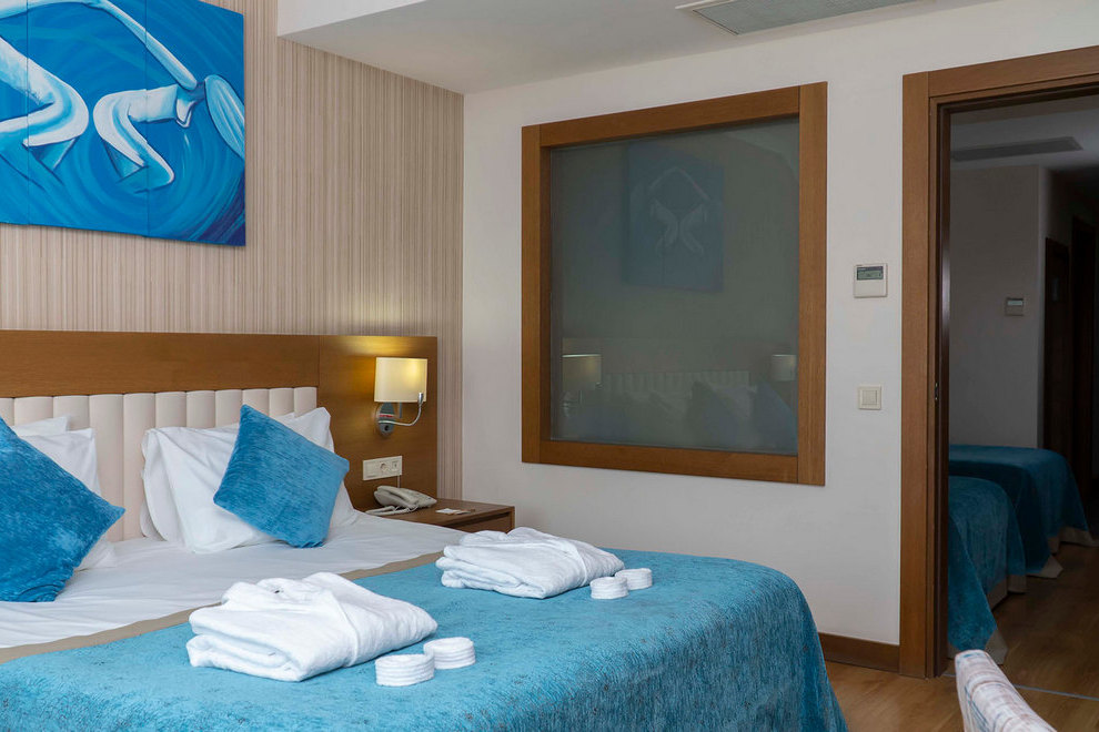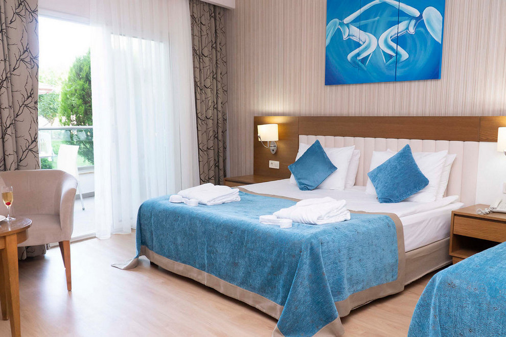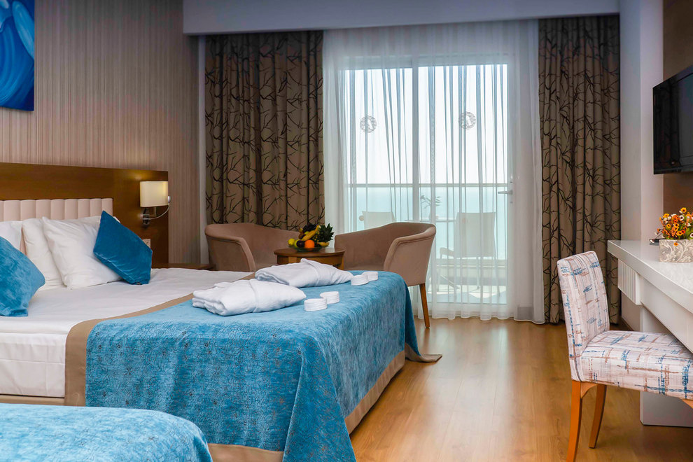 Хотелът се състои от три 5-етажни блока (5 асансьора), в които са разпределени 384 климатизирани стаи: Standard Room Land View (30 кв.м), Standard Room Sea View (30 кв.м), Standard Room Sea Side View (30 кв.м), Family Room Side Sea View (40 кв.м) и Standard Superior Comfort Room Sea View (30 кв.м). Стаите са оборудвани с LED телевизор, музикални канали, телефон с директно избиране, минибар, електрическа кана, сет за чай/кафе, сейф, WI-FI, баня с душ, сешоар, балкон. Почистване на стаите - ежедневно, смяна на спално бельо - 3 пъти седмично.