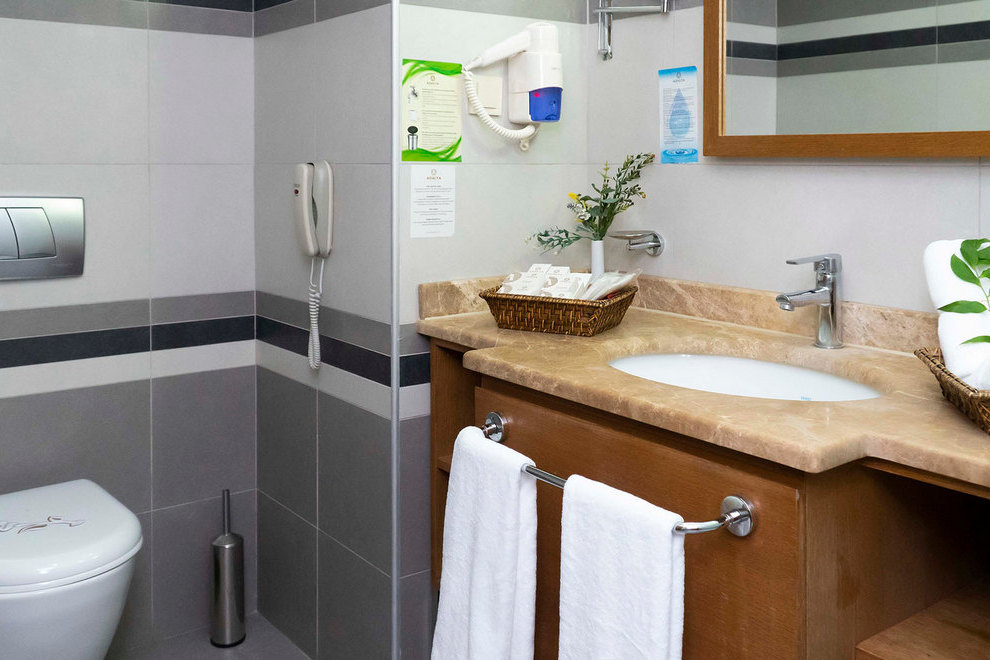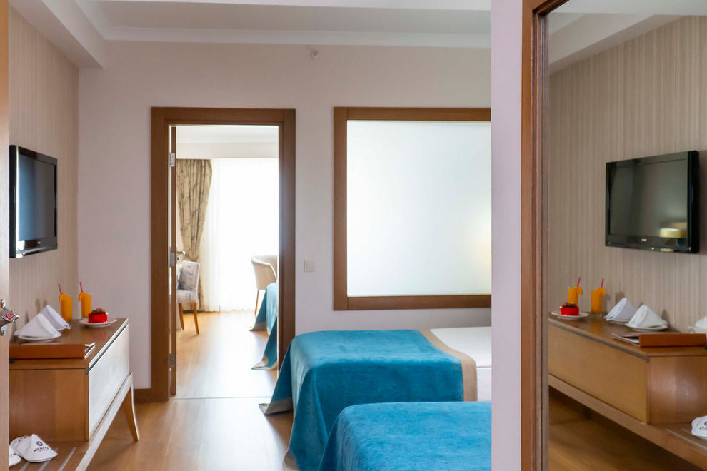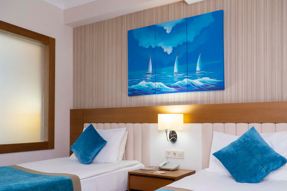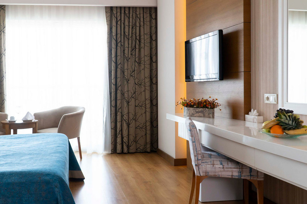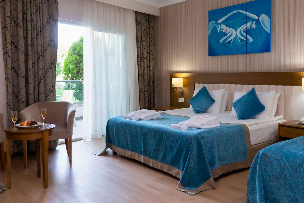Хотелът се състои от три 5-етажни блока (5 асансьора), в които са разпределени 384 климатизирани стаи: Standard Room Land View (30 кв.м), Standard Room Sea View (30 кв.м), Standard Room Sea Side View (30 кв.м), Family Room Side Sea View (40 кв.м) и Standard Superior Comfort Room Sea View (30 кв.м). Стаите са оборудвани с LED телевизор, музикални канали, телефон с директно избиране, минибар, електрическа кана, сет за чай/кафе, сейф, WI-FI, баня с душ, сешоар, балкон. Почистване на стаите - ежедневно, смяна на спално бельо - 3 пъти седмично.