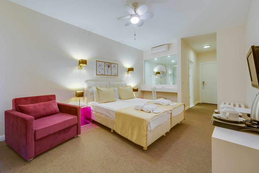 Хотелът посреща гостите и в 380 климатизирани стаи, разположени в девет 3-етажни сгради. Всички стаи са оборудвани с телевизор, телефон, минибар (минерална вода безплатно), сейф (платено), баня с душ, сешоар, балкон. Стаите се почистват всеки ден, спалното бельо се сменя 3 пъти седмично.