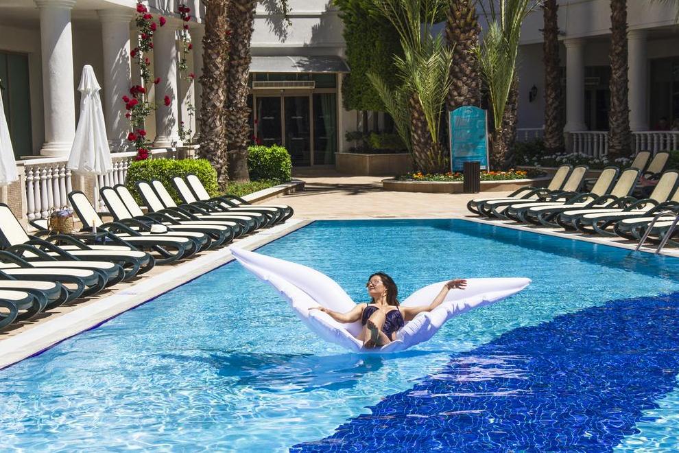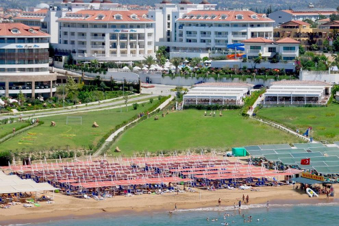 Хотелът разполага със собствен плаж, награден със Син флаг. На разположение на гостите са 1 открит басейн (с прясна вода), 1350 кв.м, неотопляем. Работно време: 07:00-19:00 ч. 1 закрит басейн със прясна вода, 120 кв.м (отопляем през студения сезон). Работно време: 07:00-19:00 ч. 4 водни пързалки за възрастни и 1 за деца (неотопляема, отворена по график). На басейна и на плажа: чадъри, плажни кърпи, шезлонги, матраци се предоставят безплатно.