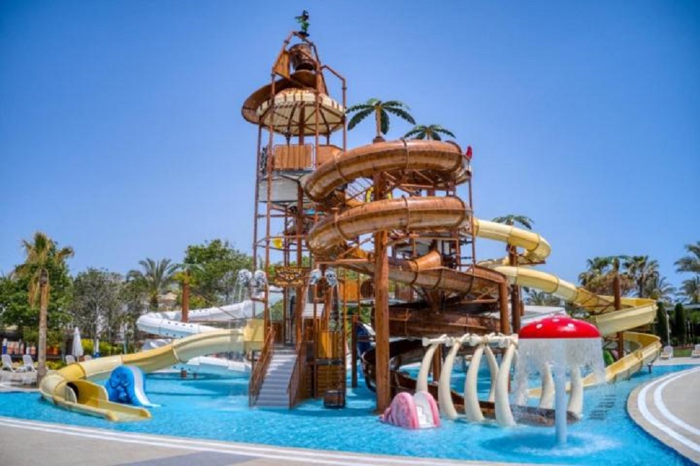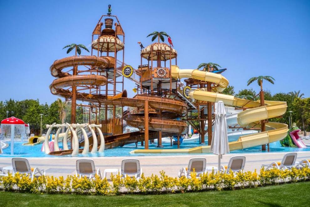 Собствен пясъчно–чакълест плаж. На разположение на гостите са 4 открити басейна (2850, 380, 560 и 50 кв. м), 2 закрити басейна (единият отопляем през зимния сезон). Басейн с 5 водни пързалки за възрастни (отопляем през зимния сезон). Интерактивен аквапарк за деца със 7 пързалки за деца и 3 пързалки за бебета. Кърпи, чадъри, шезлонги и матраци се ползват безплатно.