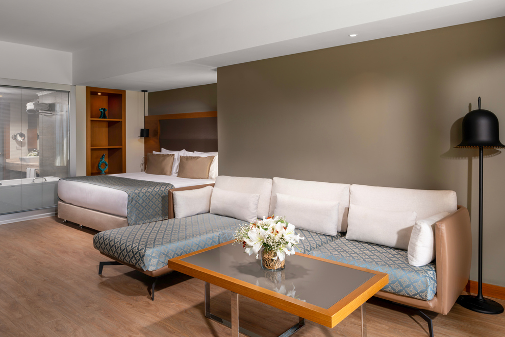 Corner Suite Side Sea View със страничен изглед море разполагат с 1 спално помещение, хол и 2 бани, в спалнята има 1 двойно и 1 единично легло, в хола има диван, площ 74 кв.м, максимално настаняване 2 + 2 деца или 3 възрастни.