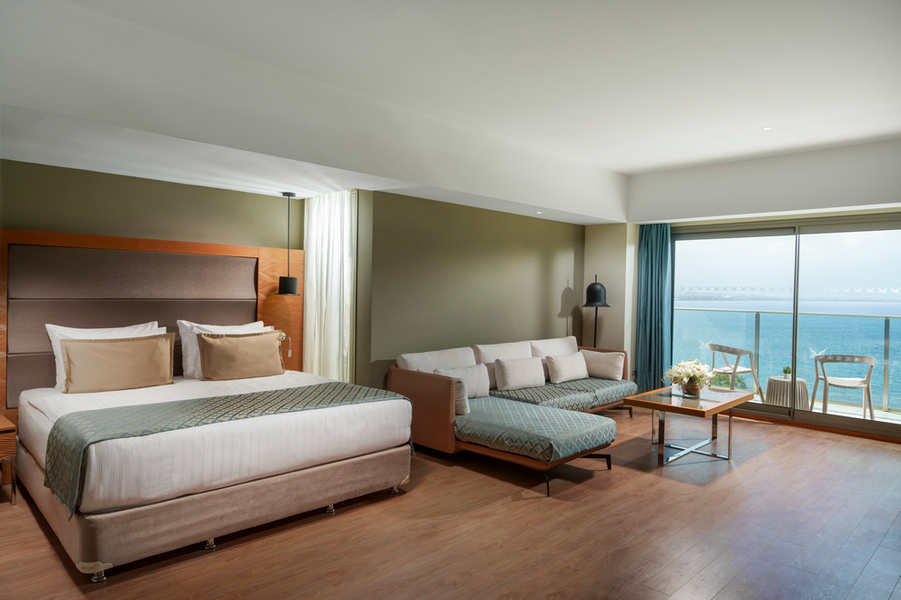 Deluxe Suite Side Sea View със странична гледка море разполагат с 1 двойно и 1 единично легло, площ 62 кв.м, максимално настаняване 2 + 1 дете