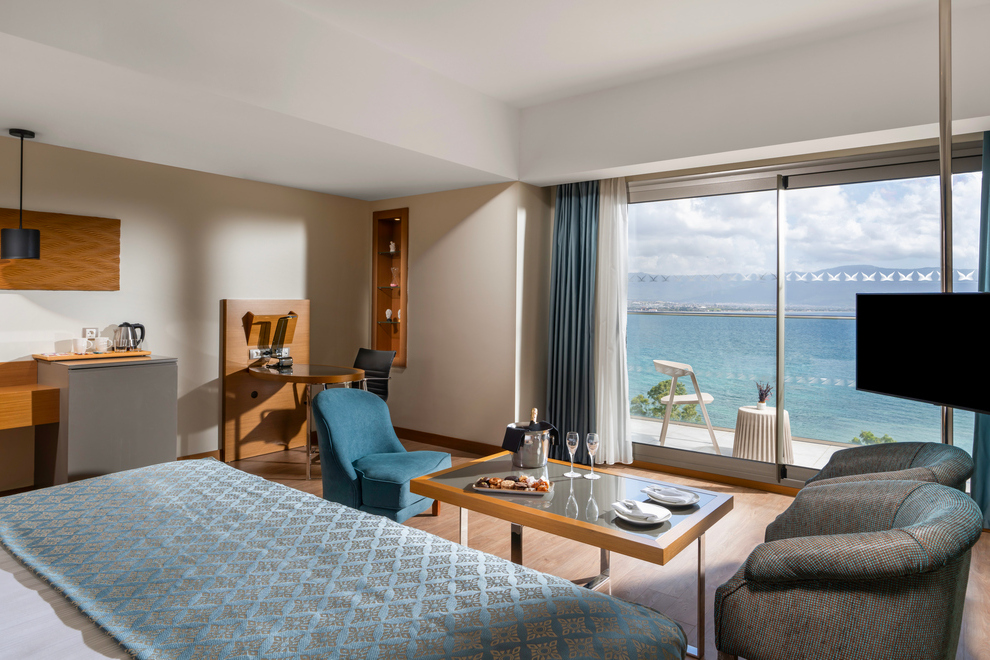 Deluxe Suite Sea View с гледка море разполагат с 1 двойно и 1 единично легло, площ 62 кв.м, максимално настаняване 2 + 1 дете