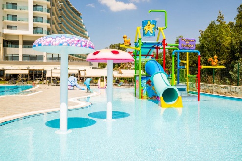 Хотелът има собствен пясъчно-чакълест плаж с платформа и кей. За удобство на гостите си има още 4 открити басейна със сладка вода, неотопляеми. 1 закрит басейн със сладка вода. 5 водни пързалки за възрастни и 3 за деца, неотопляеми, работят по график. Чадъри, шезлонги и матраци на плажа и при басейна се предоставят безплатно.