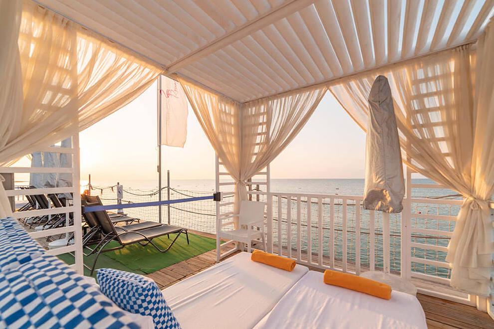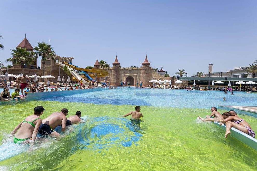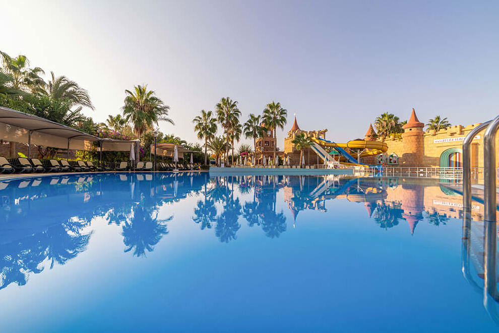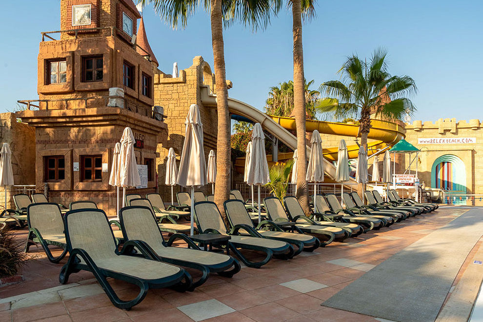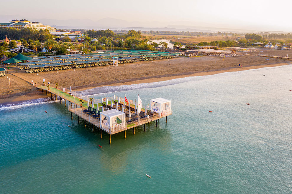 Хотелът разполага със собствен пясъчен плаж с дължина от 60 м и дървен кей. Шезлонги, чадъри, матраци, плажни кърпи се предоставят безплатно. Хотелът има два открити басейна, три пързалки, детски басейн.