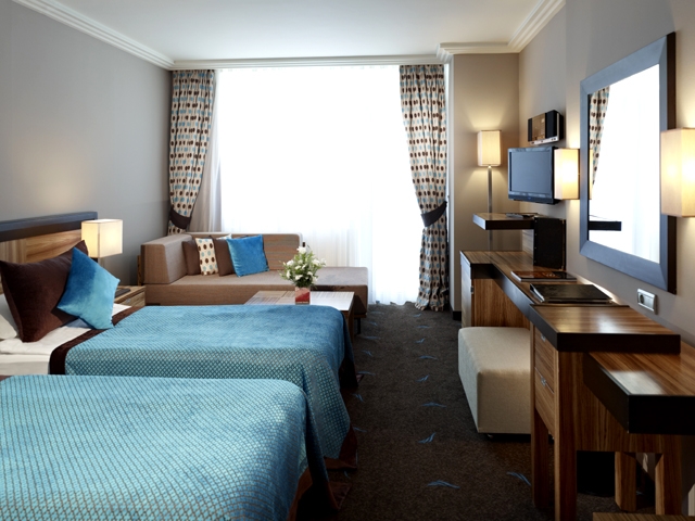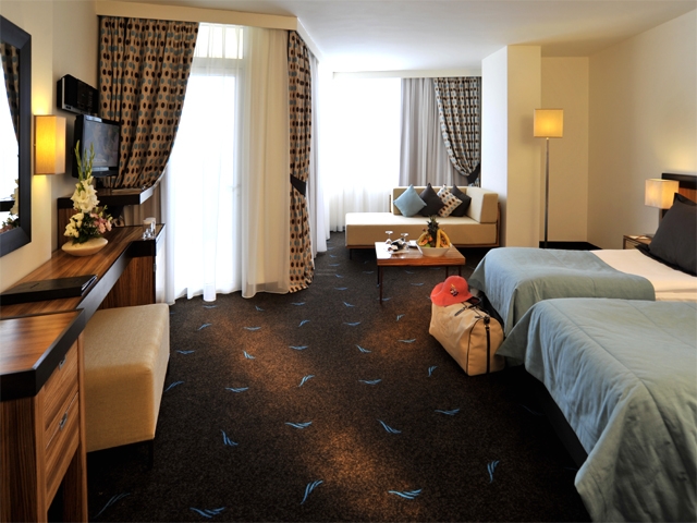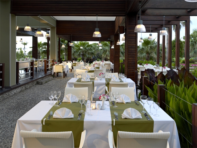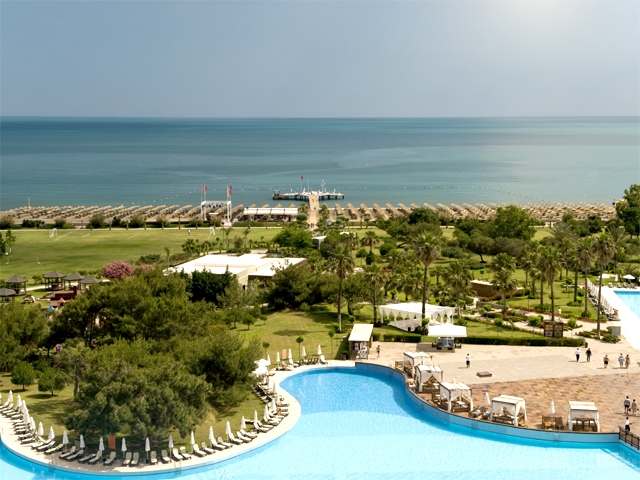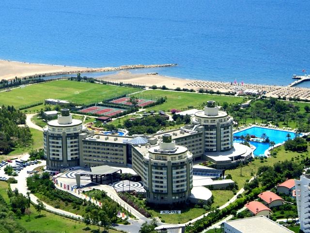 Описание Намира се: на 8 км от летище Анталия, на 10 км от центъра на града, на брега на морето. В хотела: основен ресторант, 5 а la carte ресторанта (мексикански, италиански, гръцки, барбекю, китайски – с предварително записване, по време на едноседмичния престой еднократно посещението на всеки от ресторантите е безплатно), диетично меню, 9 бара, 2 открити басейна, закрит басейн, 3 водни пързалки, киносалон, лекарски кабинет, Спа център, фризьорски салон, магазини, пране, химическо чистене, наем на автомобили, паркинг, 12 конферентни зали. Безплатно: фитнес център, сауна, турска баня, джакузи, тенис на корт, тенис на маса, дартс, баскетбол, волейбол, плажен волейбол, аеробика, кану, дискотека. Платено: масаж, билярд, боулинг (4 пътеки), интернет, видеоигри, наем на ракети за тенис и скуош, уроци по тенис и уиндсърфинг, осветление на футболните игрища, 1 професионално футболно игрище, 2 любителски футболни игрища, моторни водни видове спорт. За децата: детски басейн, детска площадка, детски аквапарк, мини клуб (4–8 год.), миди клуб (8–12 год.), макси клуб (12–16 год.), бавачка (срещу заплащане) В стаята: вана или душ, сешоар, централен климатик, плазмен телевизор, телефон, мини бар (зареждане с безалкохолни напитки и бира всеки ден, безплатно), сейф (в стаята, безплатно), халат, чехли, кърпи, балкон. Плаж: собствен – пясъчен. Чадъри, шезлонги, матраци и кърпи за плажа – безплатно.