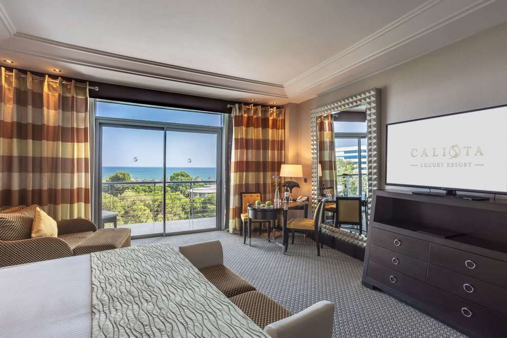 Всички стаи, суити и вили в хотелски комплекс Calista Luxury Resort имат самостоятелен балкон или тераса с гледка към морето или планините. Включват телевизор със сателитни канали, безплатен Wi-Fi достъп до интернет и просторна самостоятелна баня.