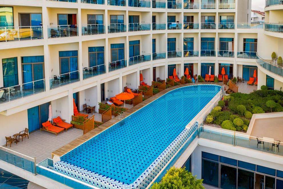 Собствен пясъчен плаж на около 5 минути пеша от хотела. Открит басейн с водни пързалки.